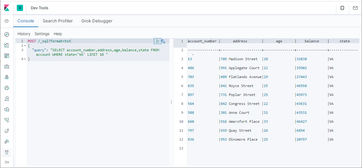 "query": "SELECT account_number,address,age,balance,state FROM account WHERE state='VA' LIMIT 10 "