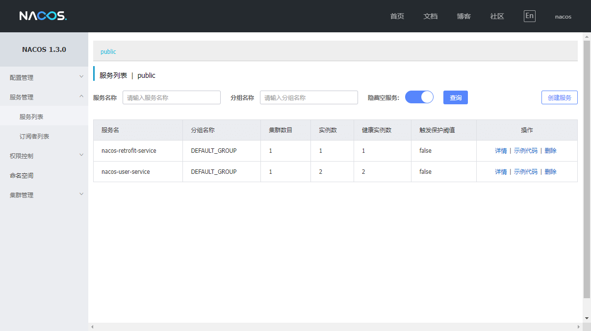 nacos-user-service服务和1个nacos-retrofit-service服务,此时Nacos注册中心显示如下;