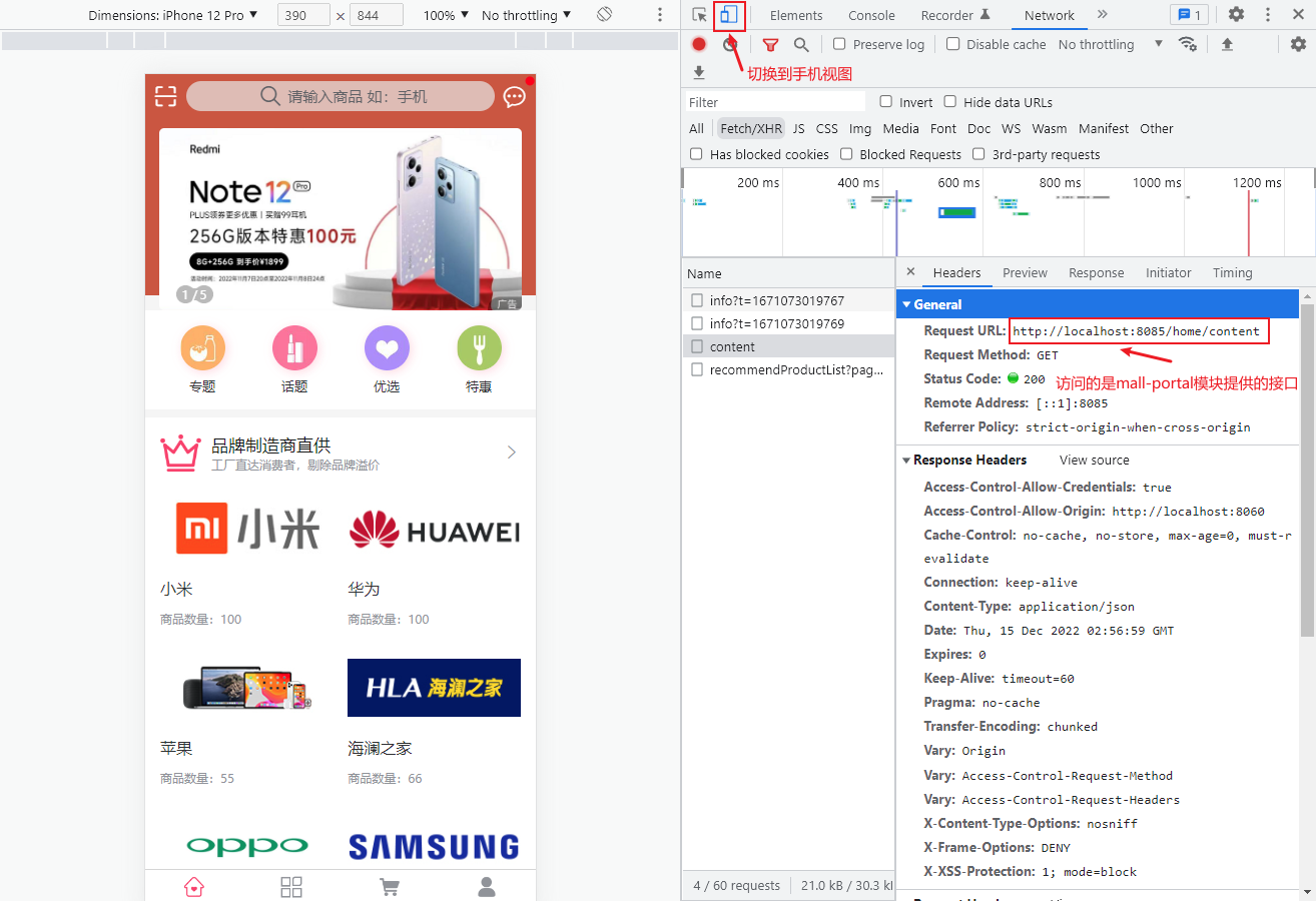 F12打开chrome浏览器的开发者工具,点击手机按钮切换到移动端视图,此时可以发现项目访问的是mall-portal模块提供的接口,访问地址:http://localhost:8060/