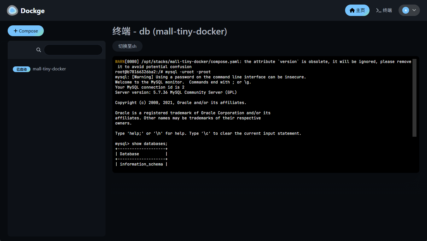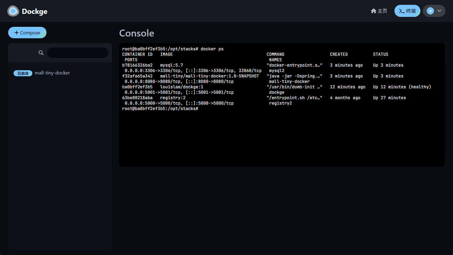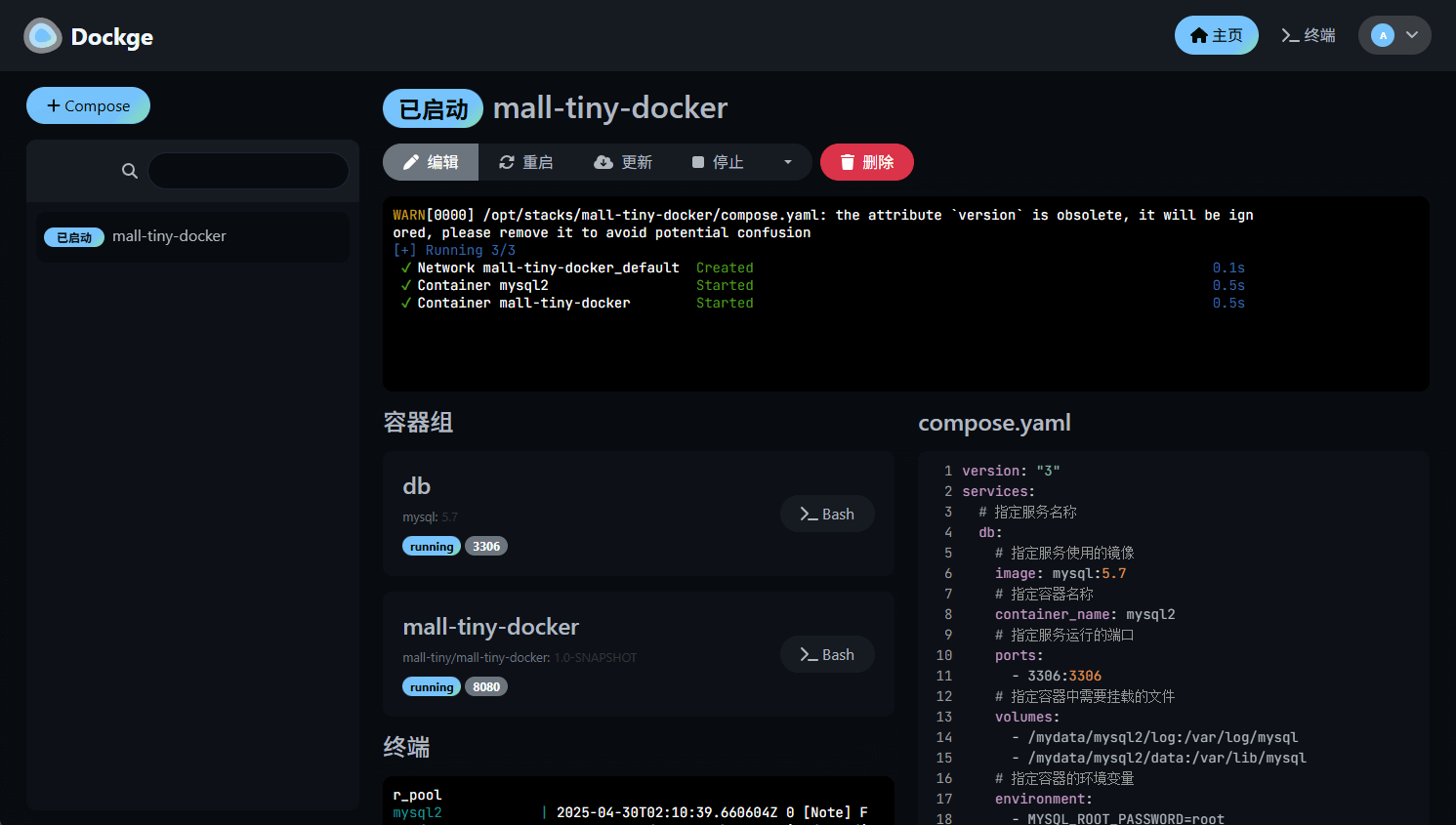 终端按钮即可,可以发现我们的mysql和mall-tiny-docker容器已经正常启动了;