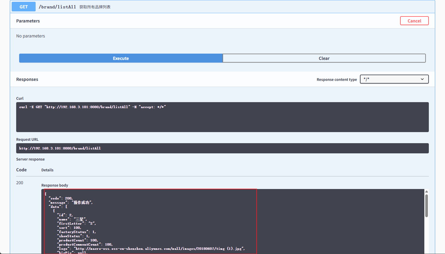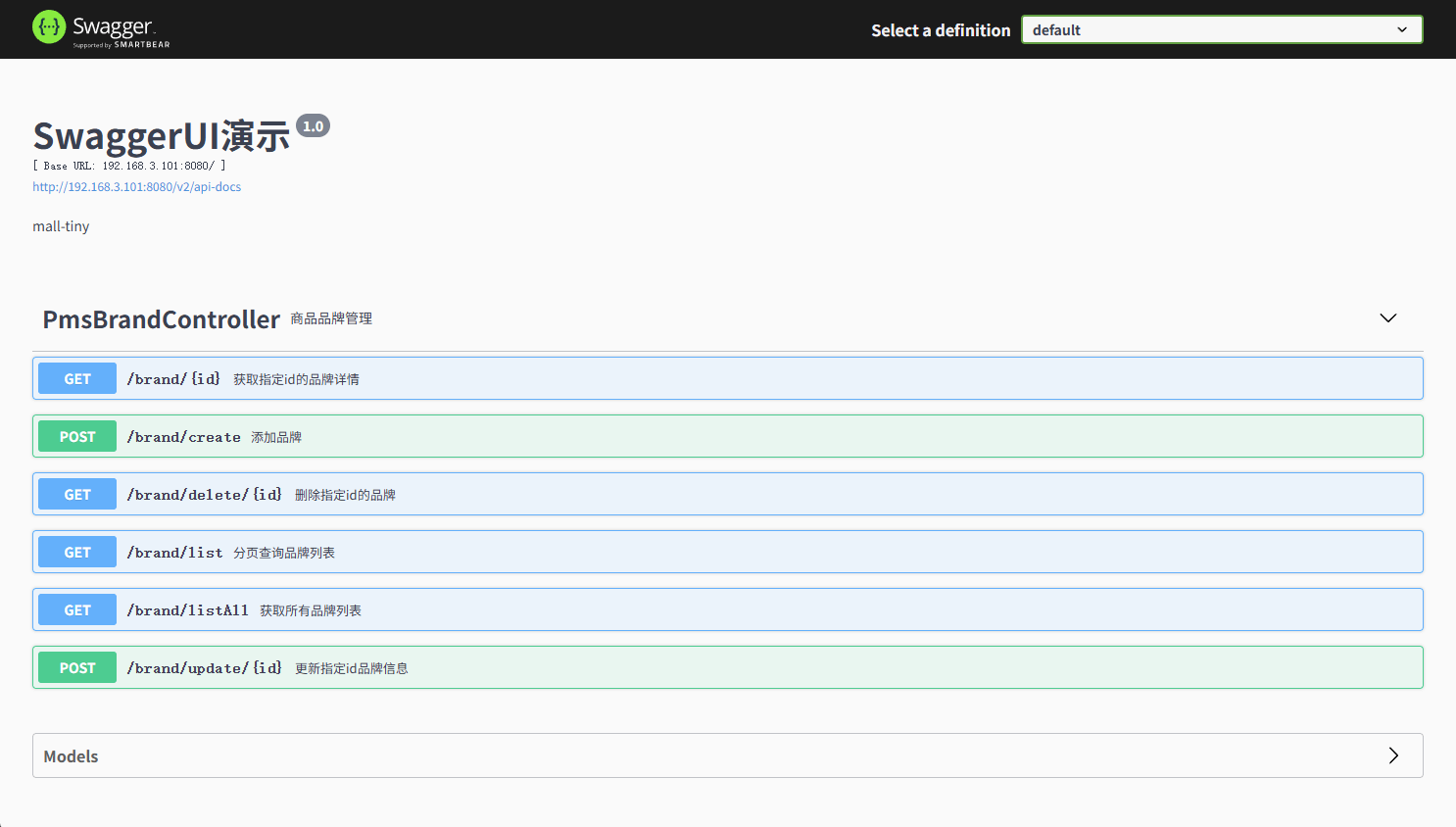mall-tiny-docker集成了Swagger API文档,我们可以测试下它是否能正常操作MySQL,API文档访问地址:http://192.168.3.101:8080/swagger-ui/