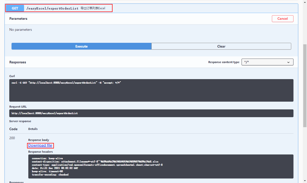 }- 在Swagger中访问接口测试,导出订单列表对应Excel;
