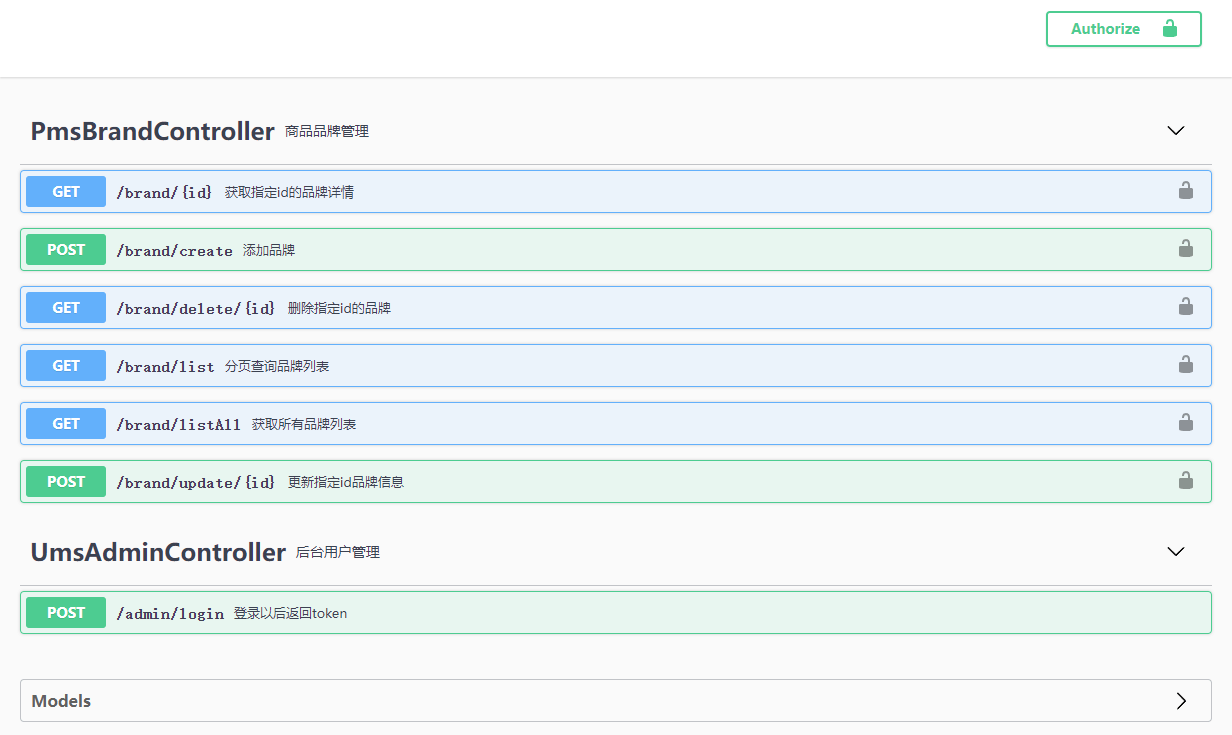 mall-tiny-swagger这个Demo,打开Swagger看下,里面有一个登录接口和需要登录认证的商品品牌CRUD接口,项目地址:https://github.com/macrozheng/mall-learning/tree/master/mall-tiny-swagger