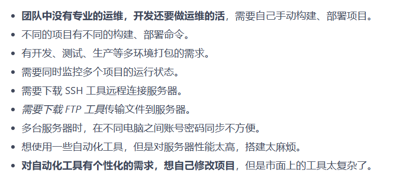在开发或生产环境中,我们有时候会上服务器器然后敲命令来部署项目。这种敲命令的方式不仅麻烦,有时候还容易出错,此时使用一套自动化部署方案,不仅方便还不易出错。 最近发现了一款好用的自动化部署工具Jpom,体验不输Jenkins,分享给大家!