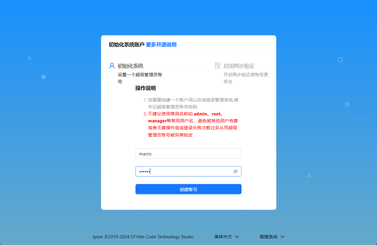 - 账户创建完成后就可以访问Jpom的控制台页面了。