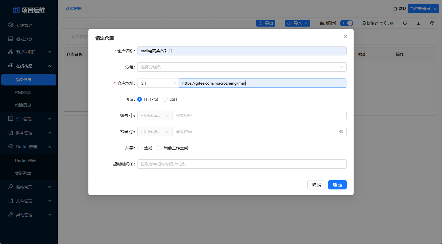 仓库信息中添加一个仓库,仓库地址:https://gitee.com/macrozheng/mall