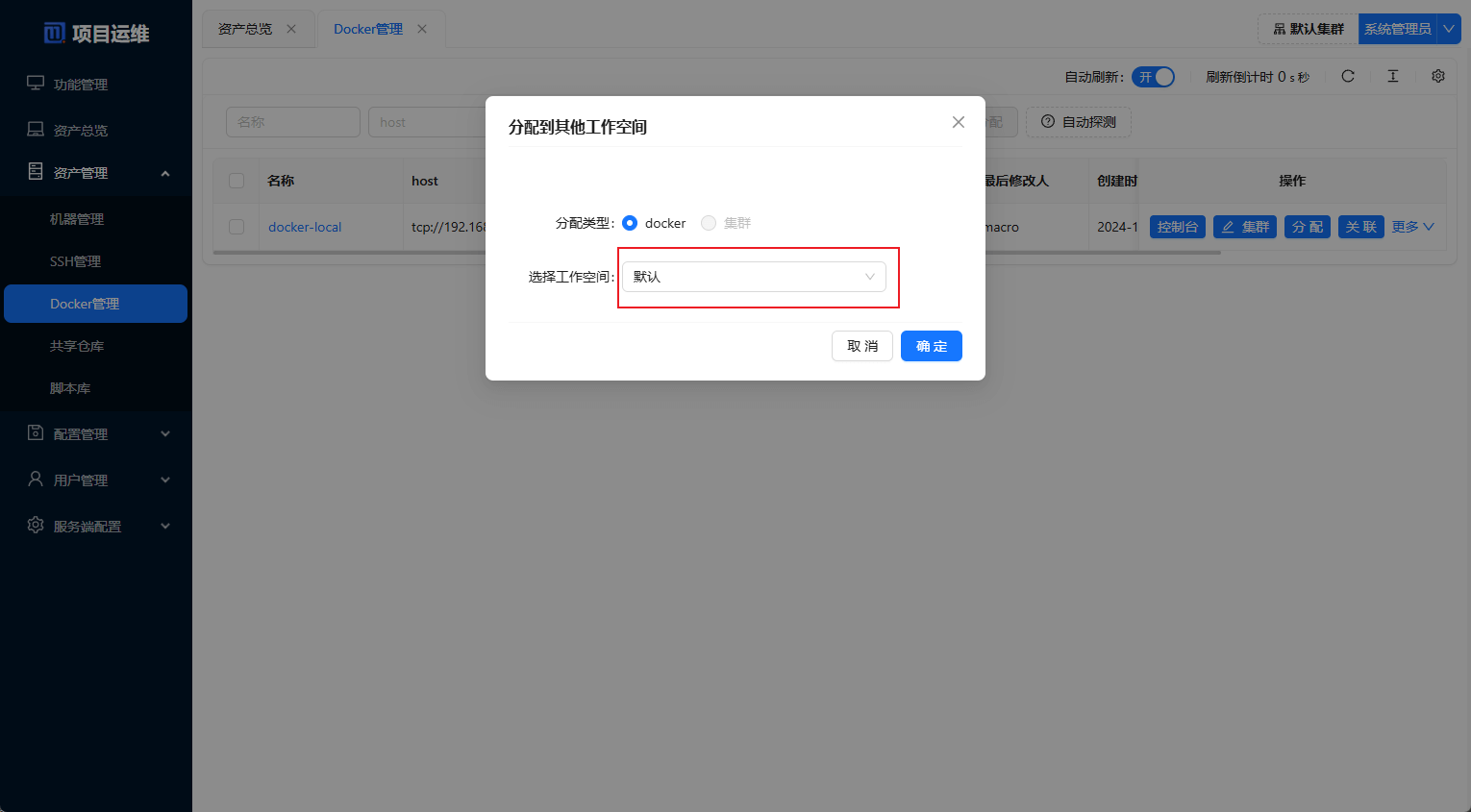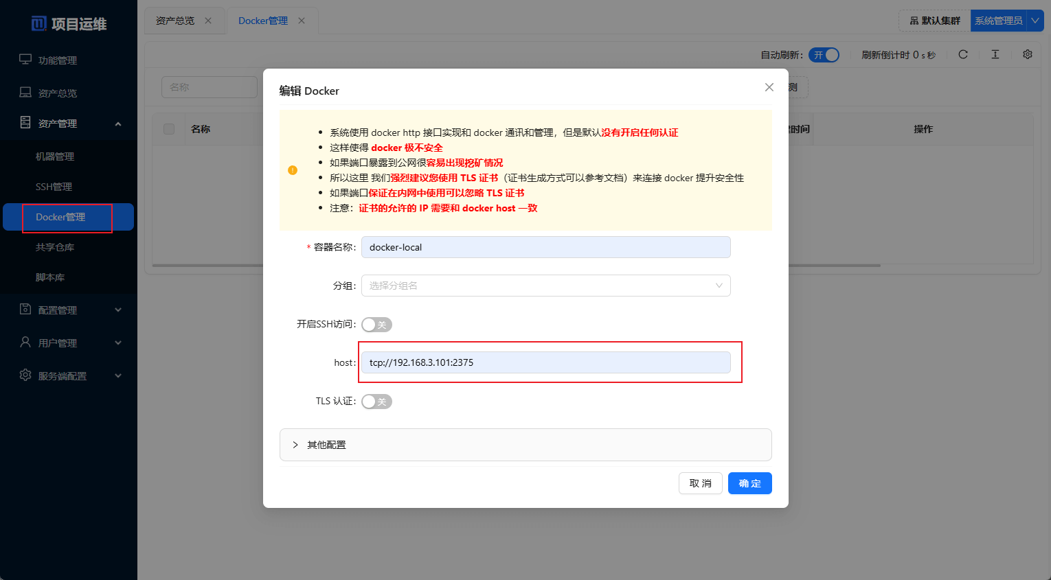 Docker管理中添加添加一个Docker环境,注意Docker环境需要开启远程API访问;