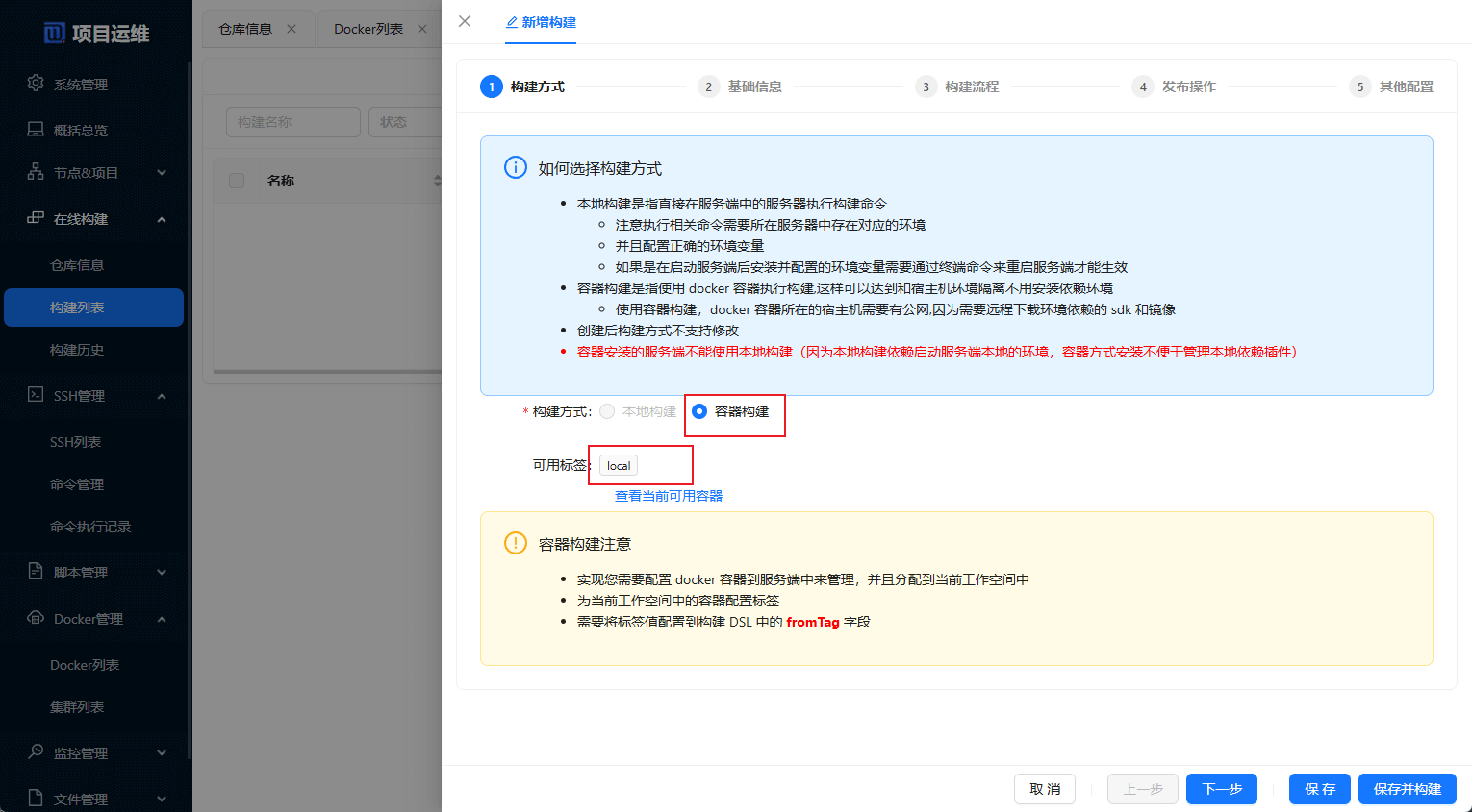 构建列表中新增一个容器构建,注意需要给Docker容器添加local标签;