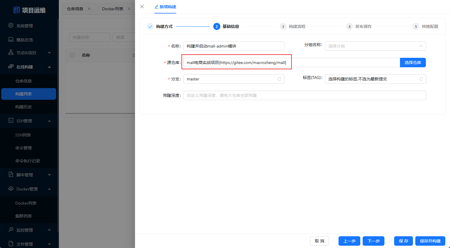 - 接下来配置好需要构建项目的仓库地址,这里使用了mall项目的仓库地址;