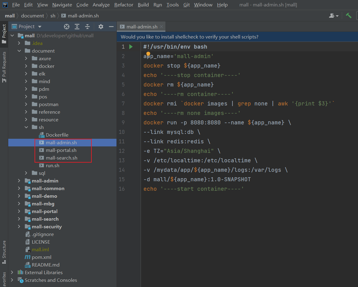 - mall项目的容器启动脚本在项目的
