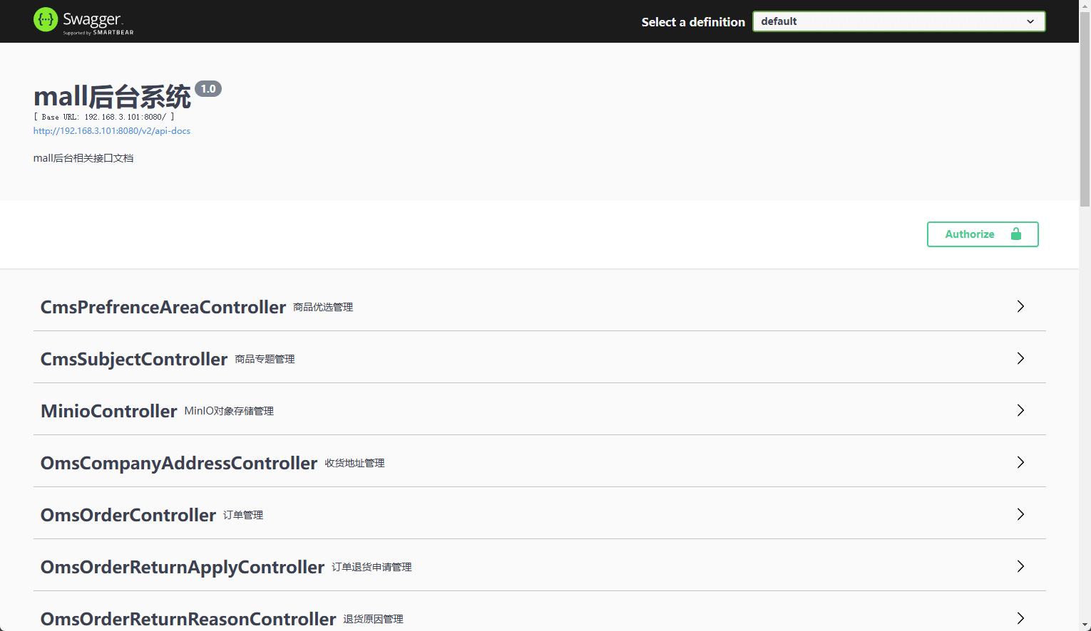 mall-admin服务的API文档了,访问地址:http://192.168.3.101:8080/swagger-ui/