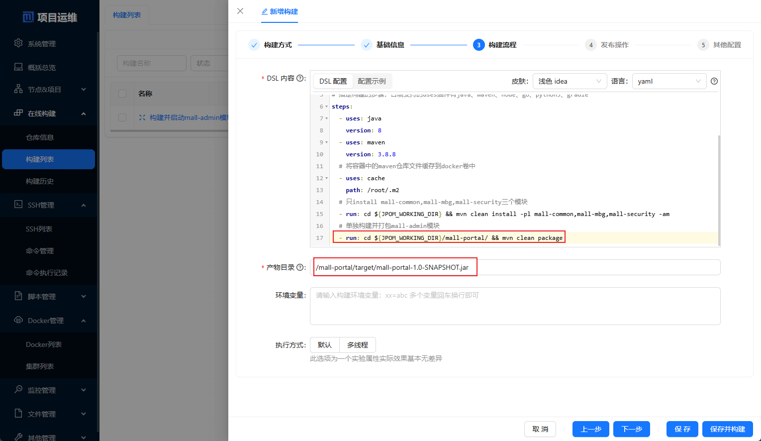 构建流程的配置,使用如下脚本进行mall-admin模块的构建,产物目录为/mall-admin/target/mall-admin-1.0-SNAPSHOT.jar;