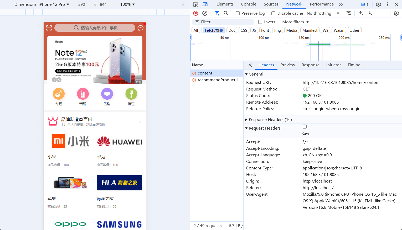 - 然后把前台商城系统的前端运行起来看下效果,使用下功能可以发现后端服务是正常运行的。