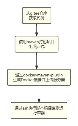 从gitee仓库获取代码->使用maven打包项目->通过插件生成Docker镜像->通过ssh执行脚本运行容器;