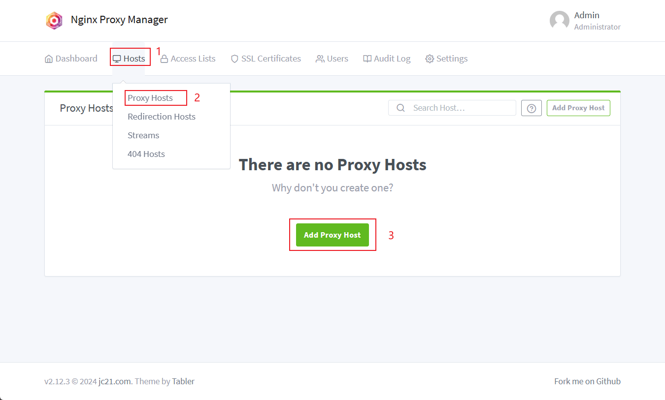 Hosts->Proxy Hosts->Add Proxy Host来添加代理主机;