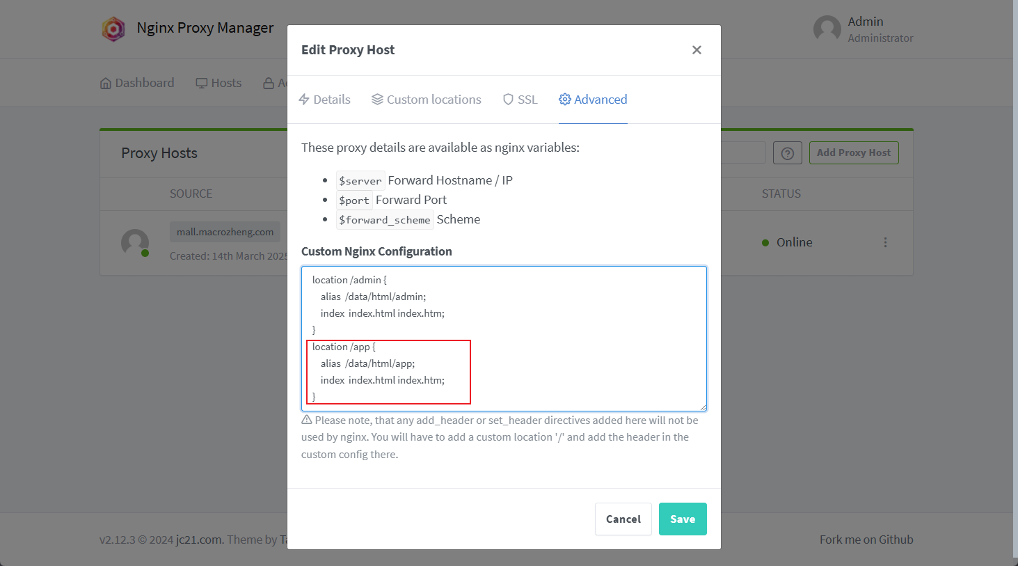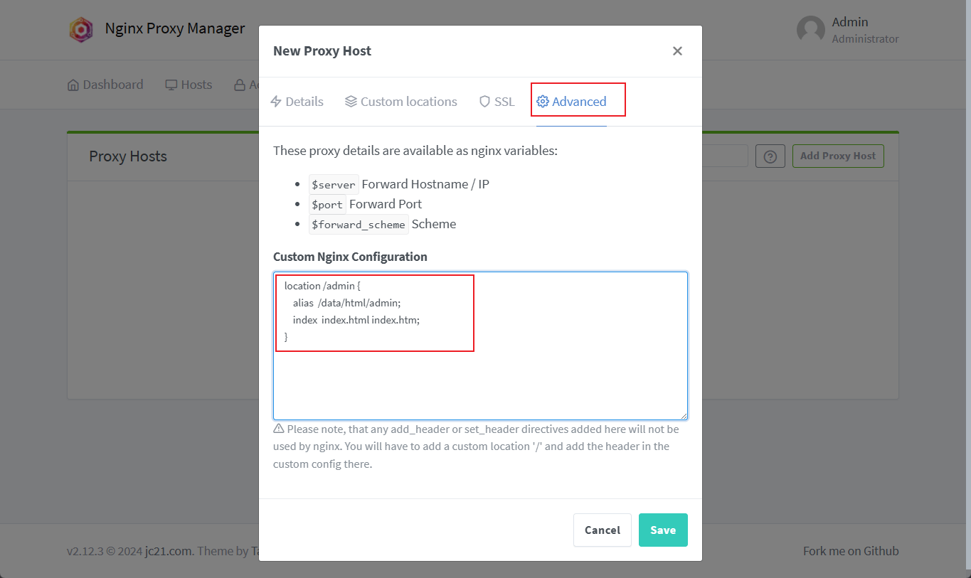 Advanced中添加自定义的Nginx配置;