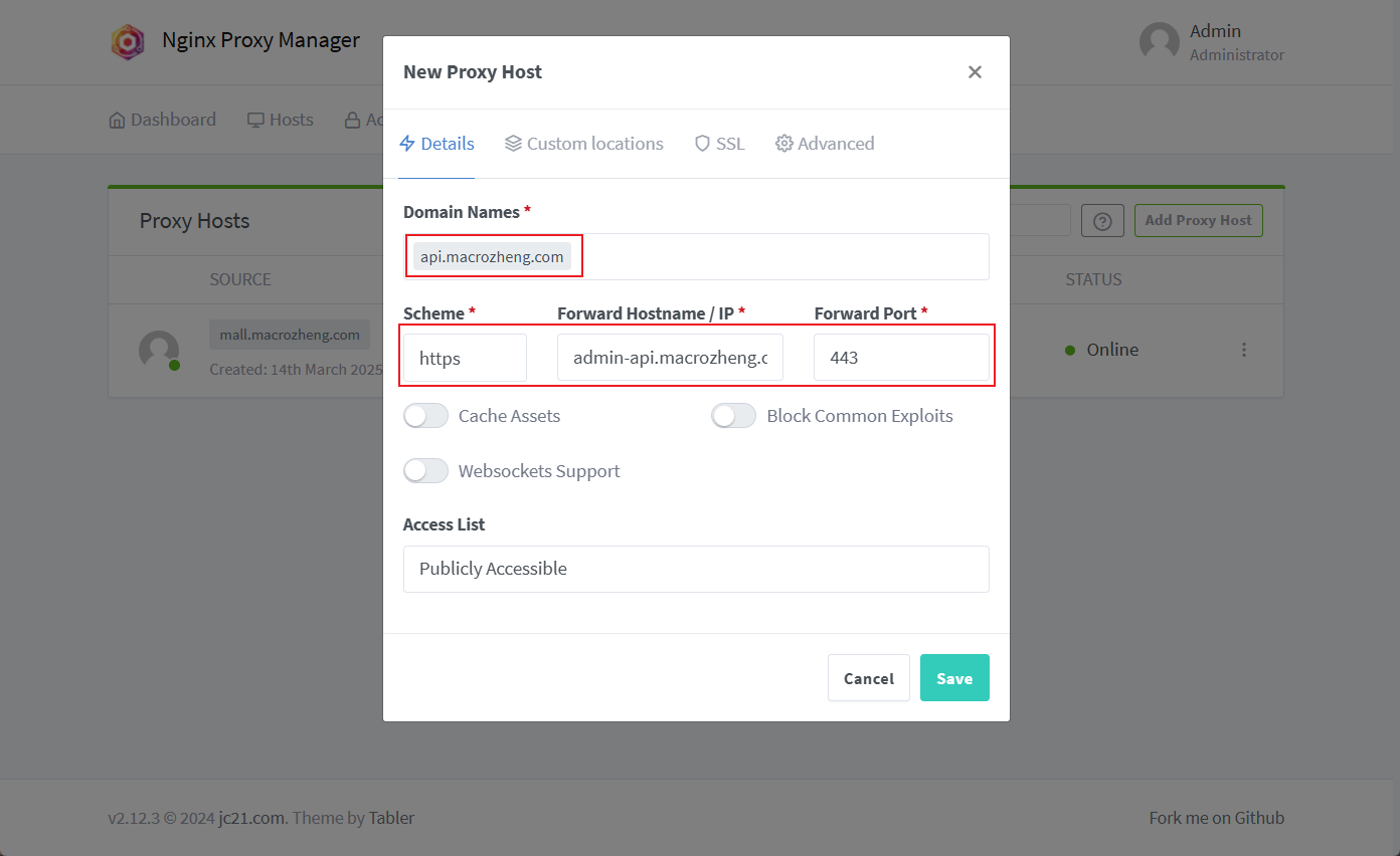 Details中设置好域名和转发的服务器信息;