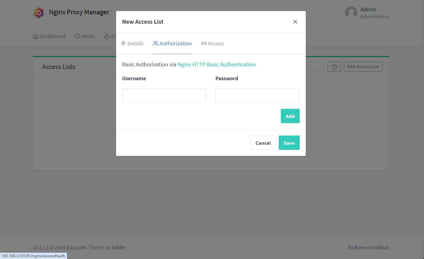 Access Lists功能可以实现代理主机的Basic认证;