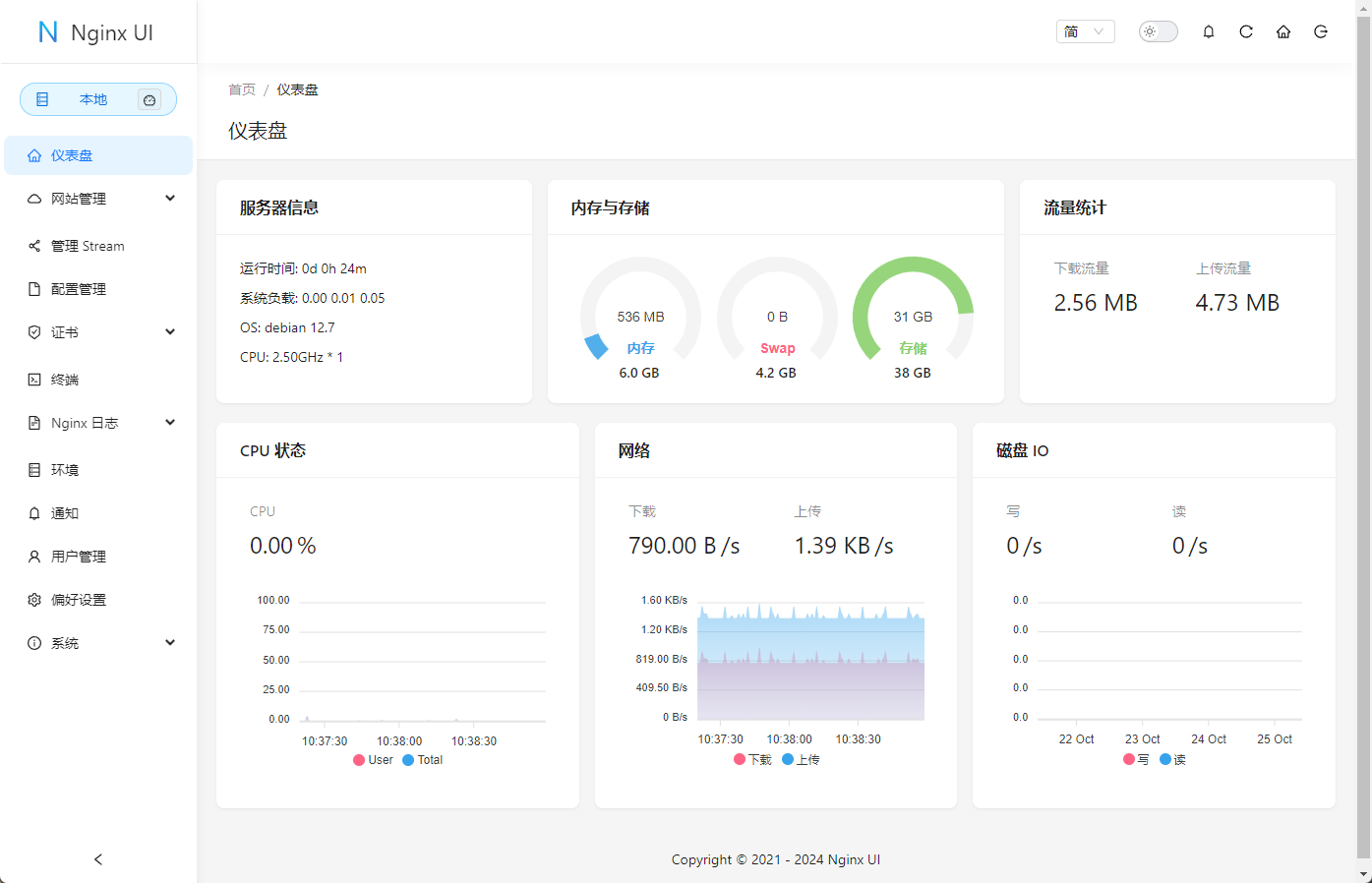 登录成功之后,我们就可以访问Nginx UI的仪表盘了,从仪表盘我们可以查看到服务器的各种指标信息,比如CPU、网络、磁盘IO等。