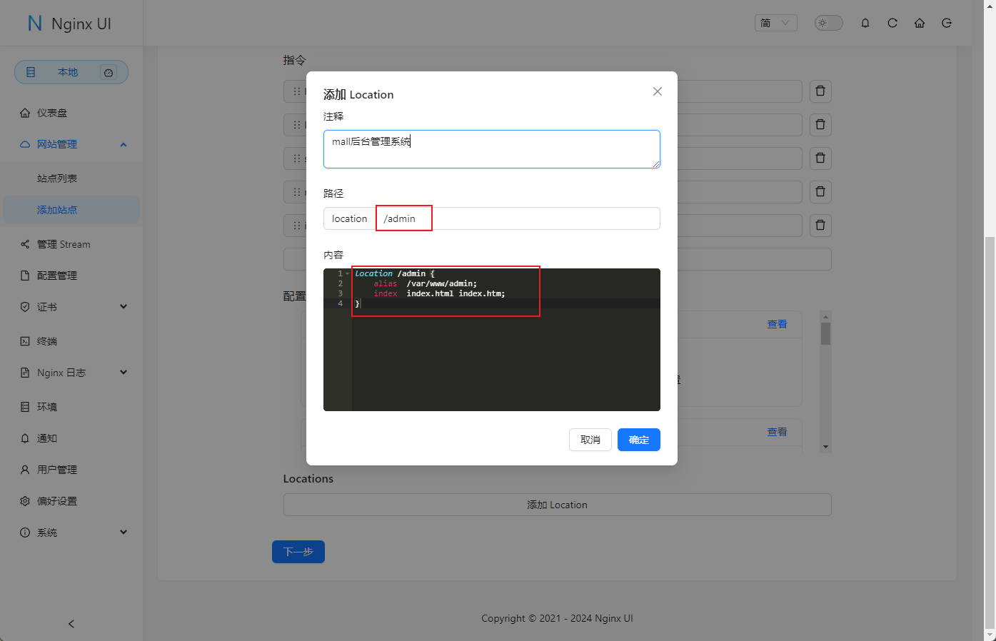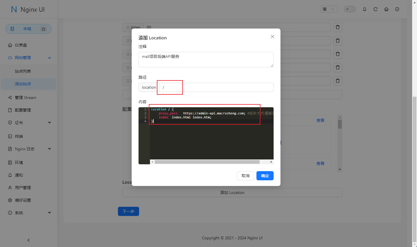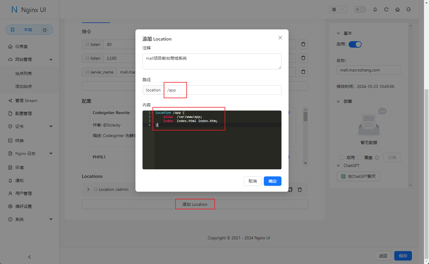 mall-app-web,修改之前的站点配置,再添加一个新的Location保存即可;