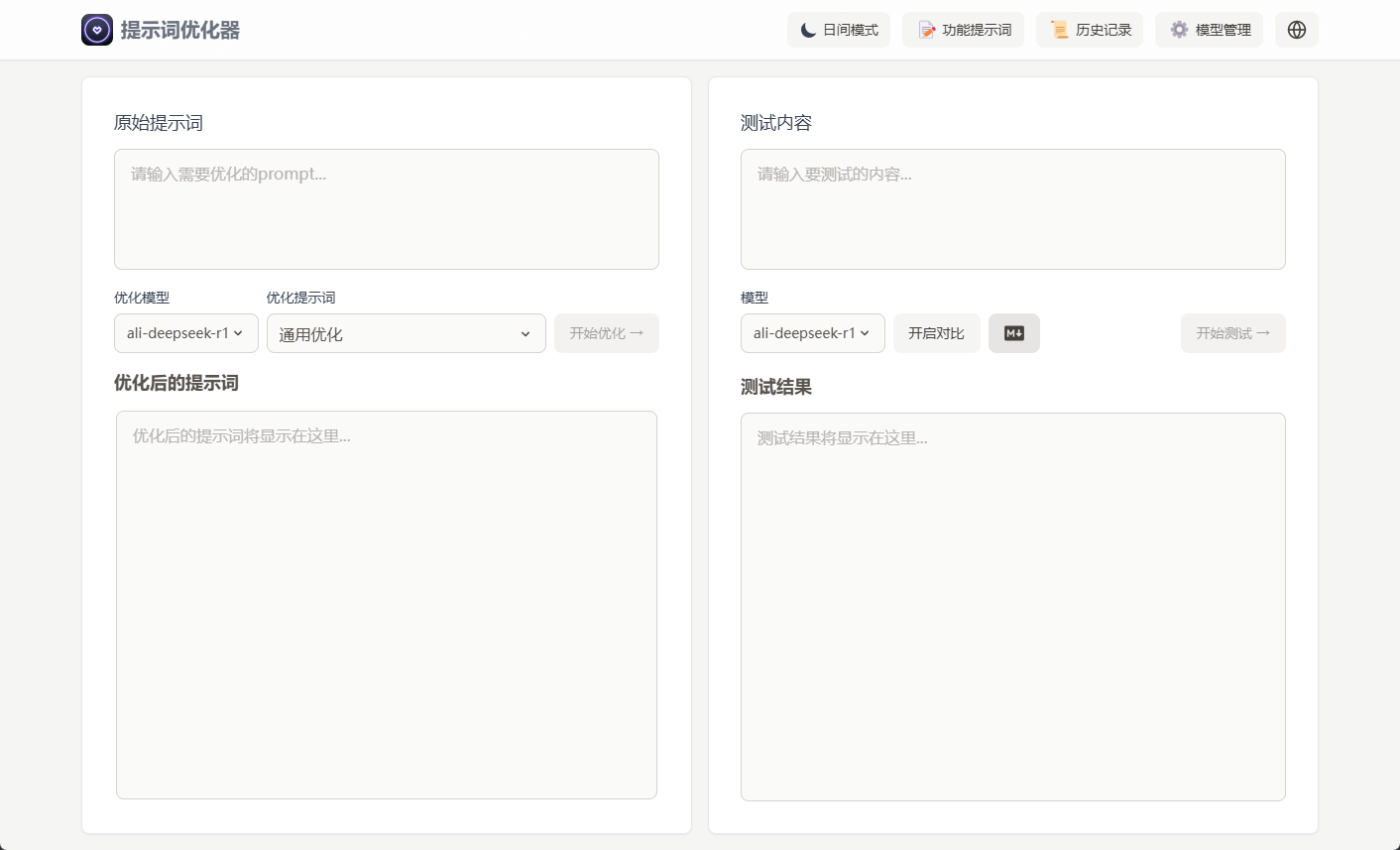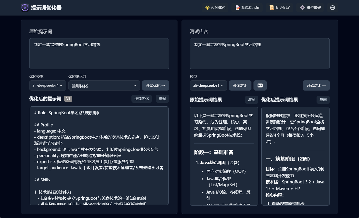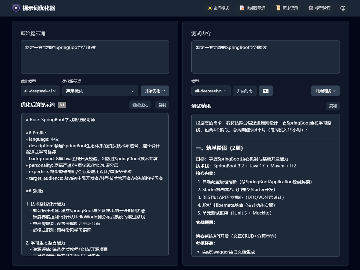 - 对比测试:支持原始提示词和优化后提示词的对比显示,能直观看出差别。