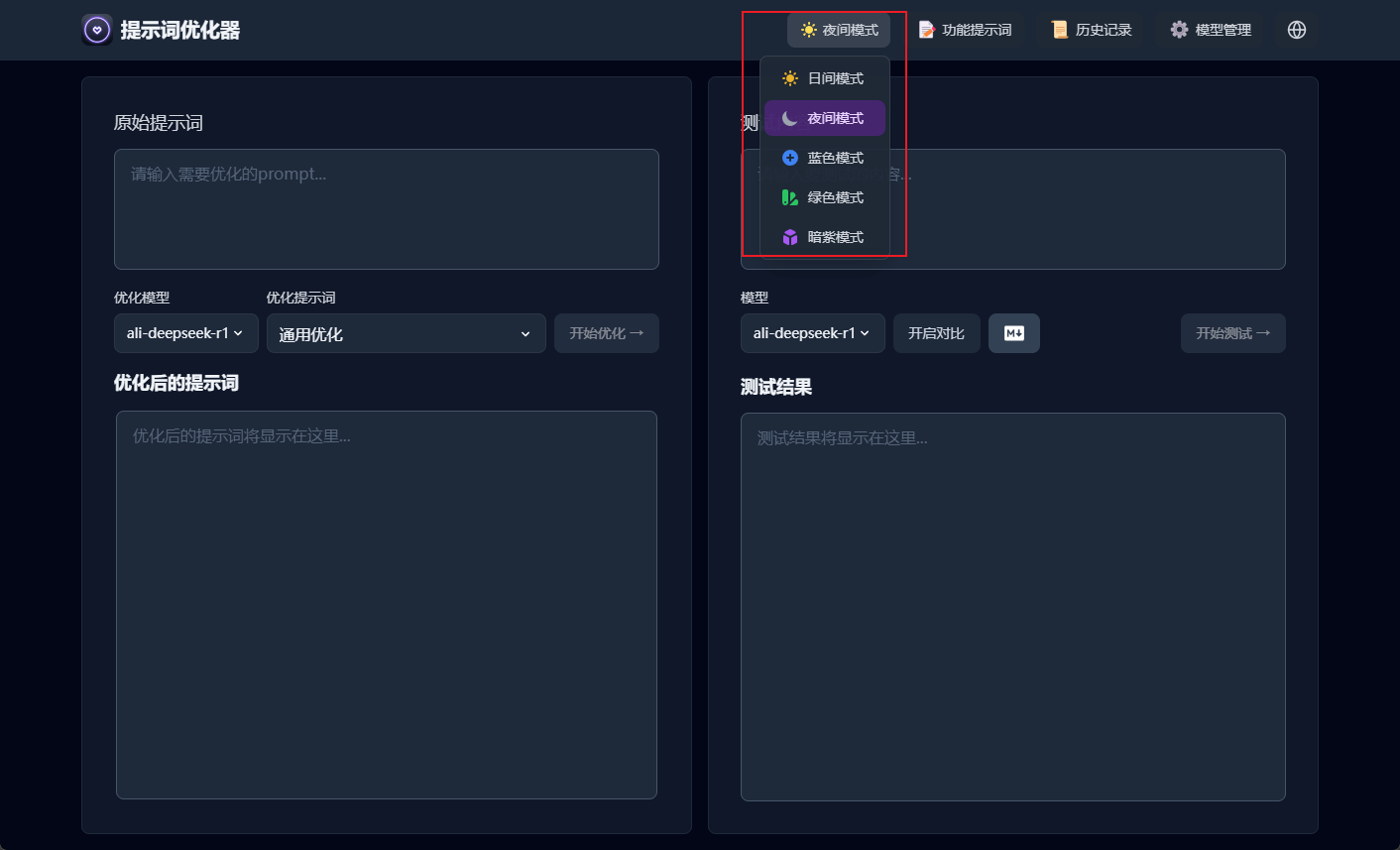 - Prompt Optimizer支持多种主题设置,个人比较喜欢夜间主题,大家使用的时候可以设置下自己喜欢的主题;