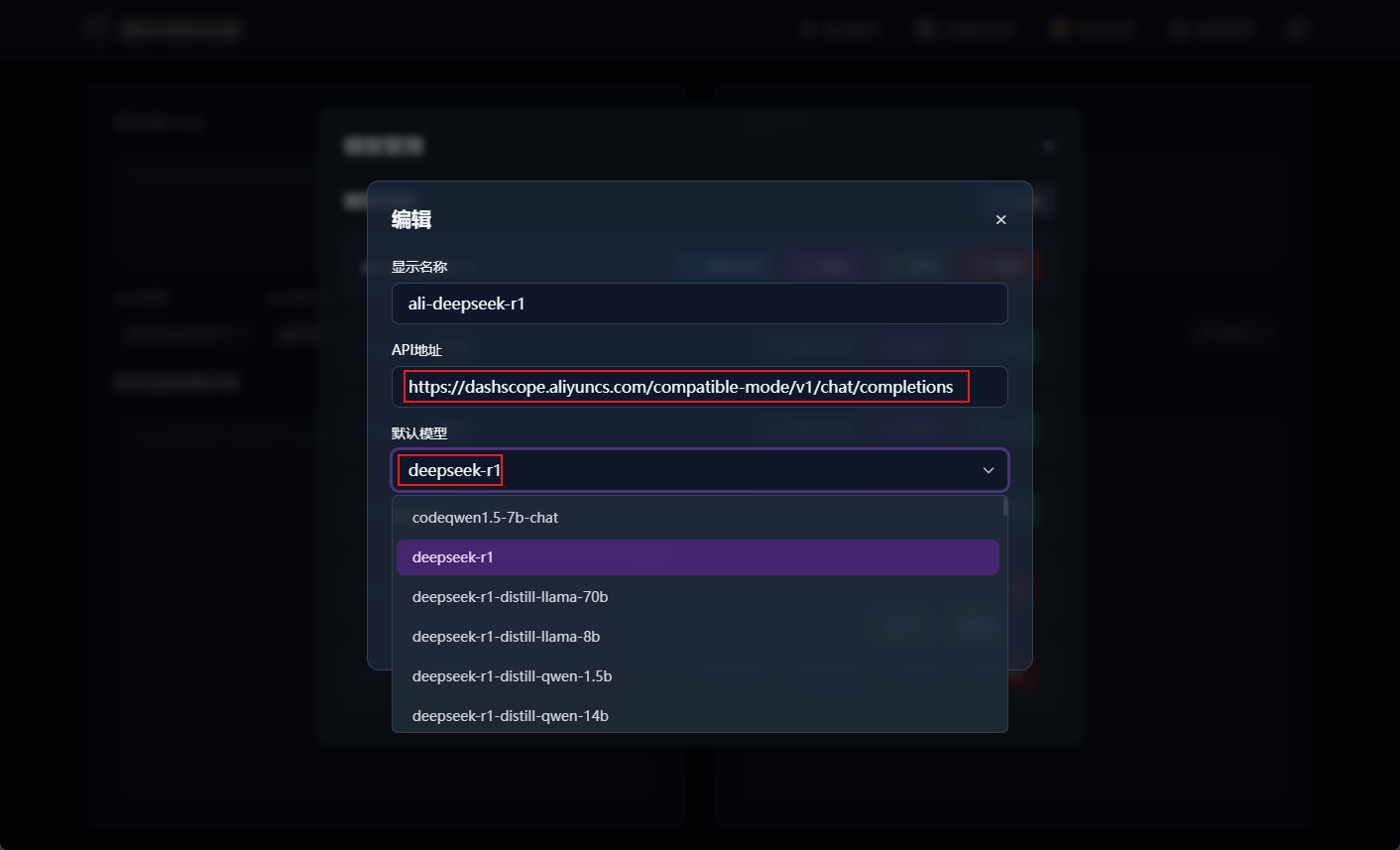 模型设置按钮进行模型设置,我这里使用的是阿里云百炼平台提供的deepseek-r1模型;