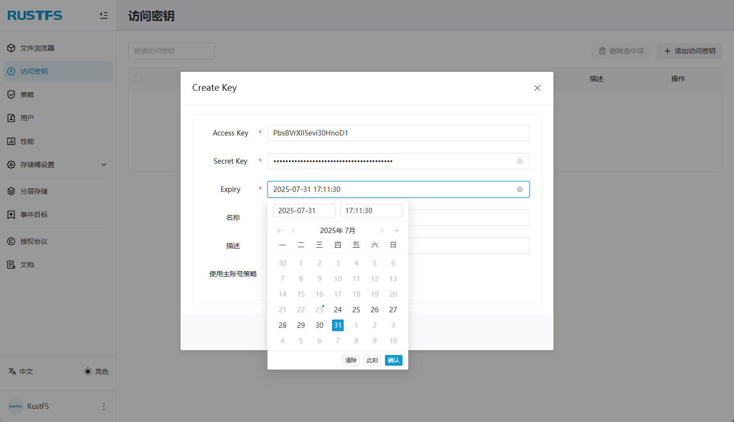 访问密钥功能,可以创建一个有过期时间的密钥,并且可以设置文件访问策略;