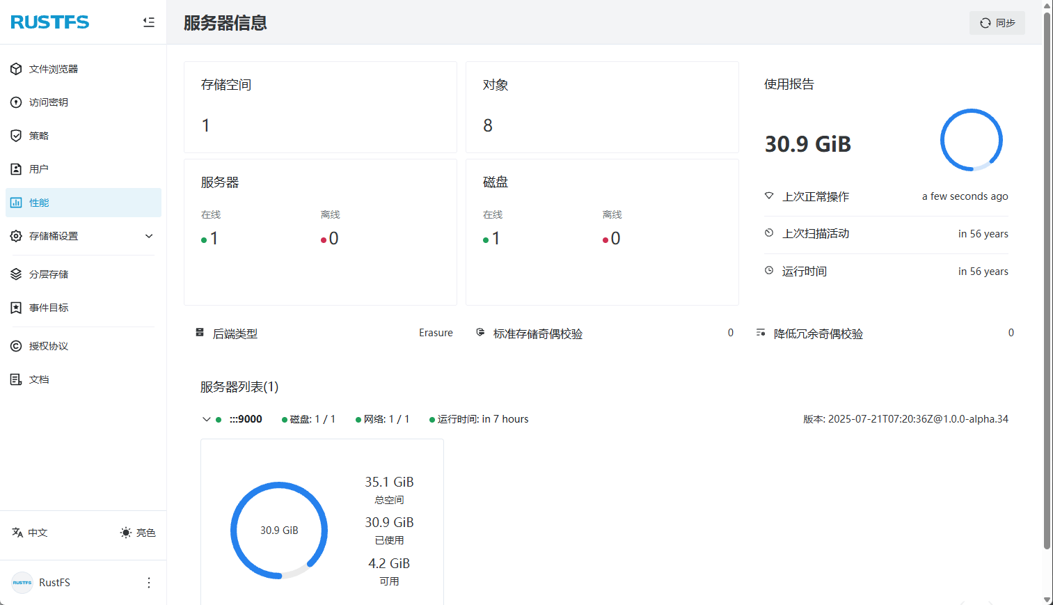 性能功能,可以查看当前RustFS服务器的基本信息。