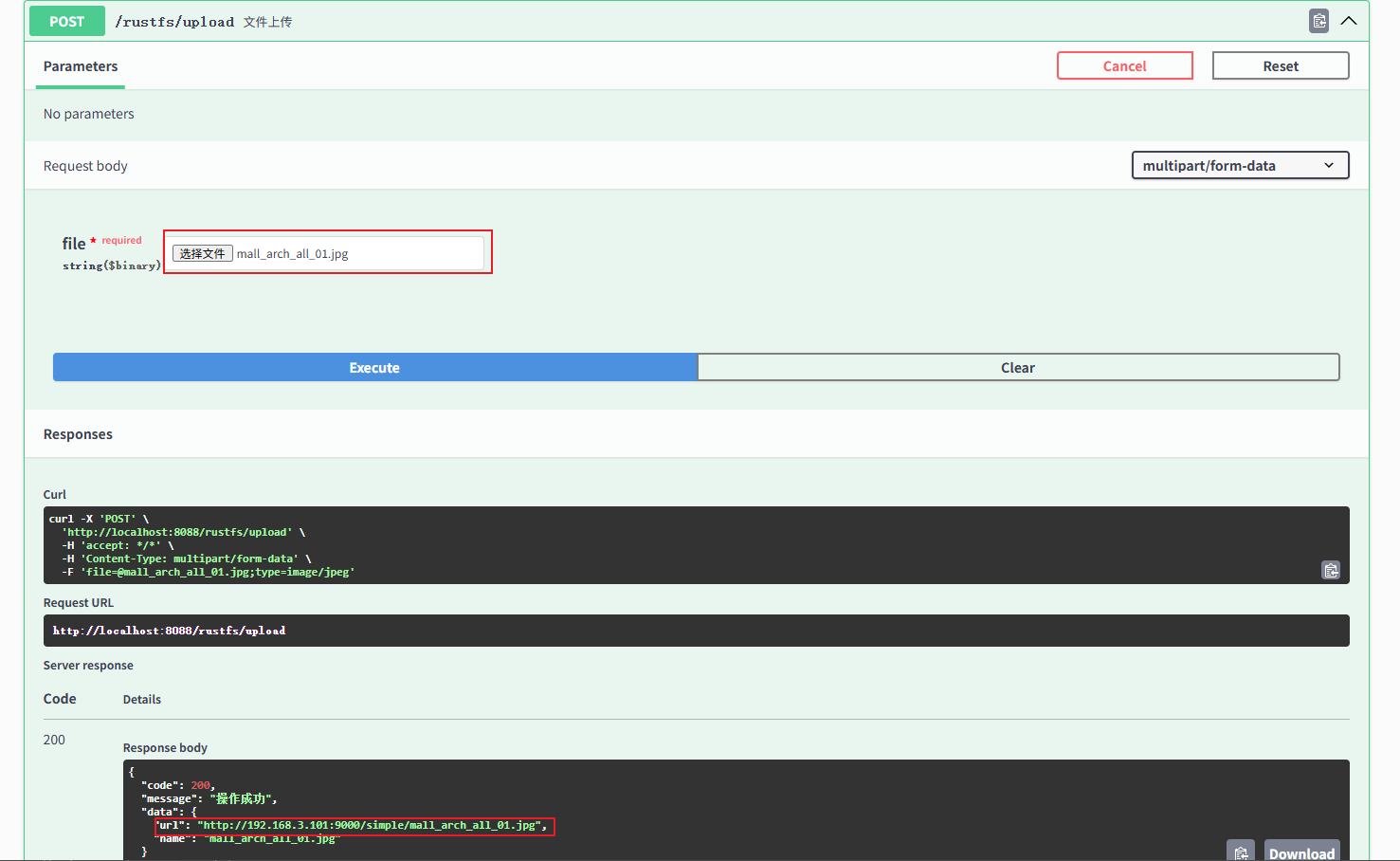 }- 由于我们的项目中集成了Swagger,可以直接通过接口文档进行测试,选择好文件后调用