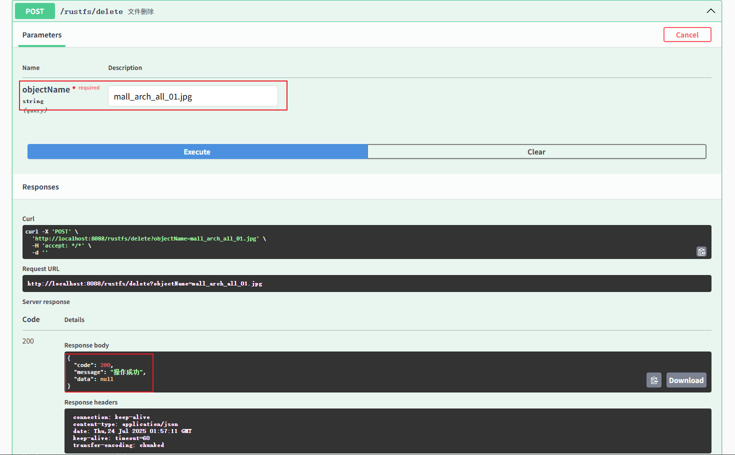 文件删除接口,传入对应的objectName即可将文件删除。