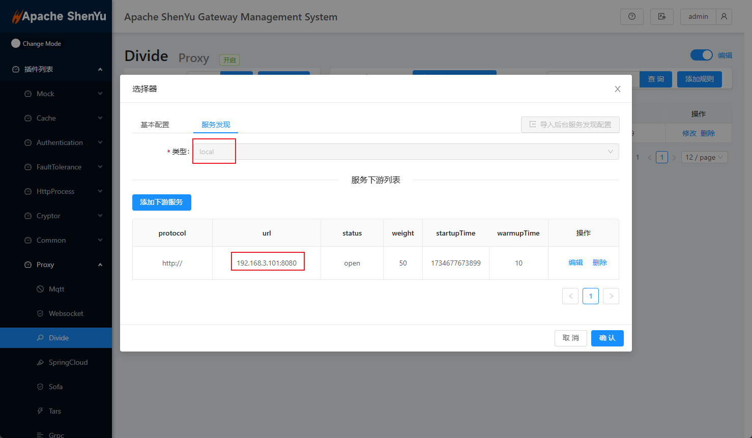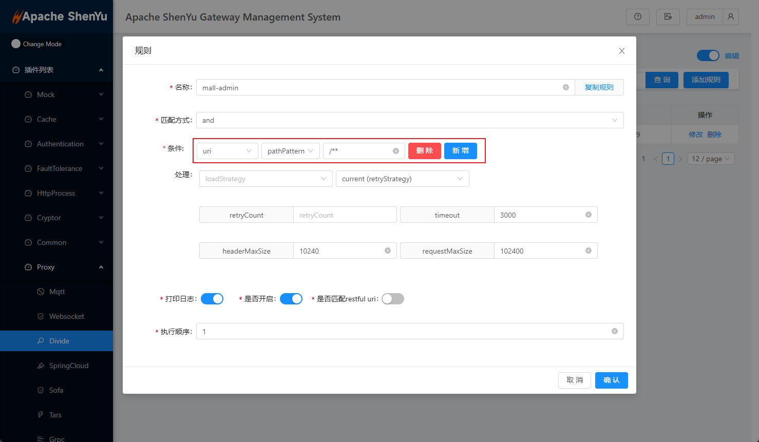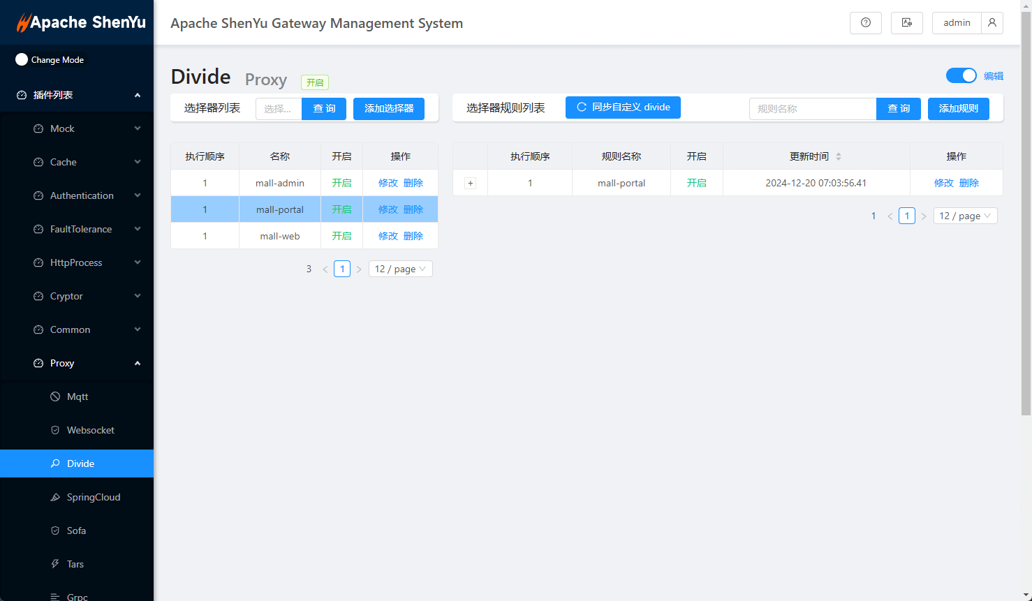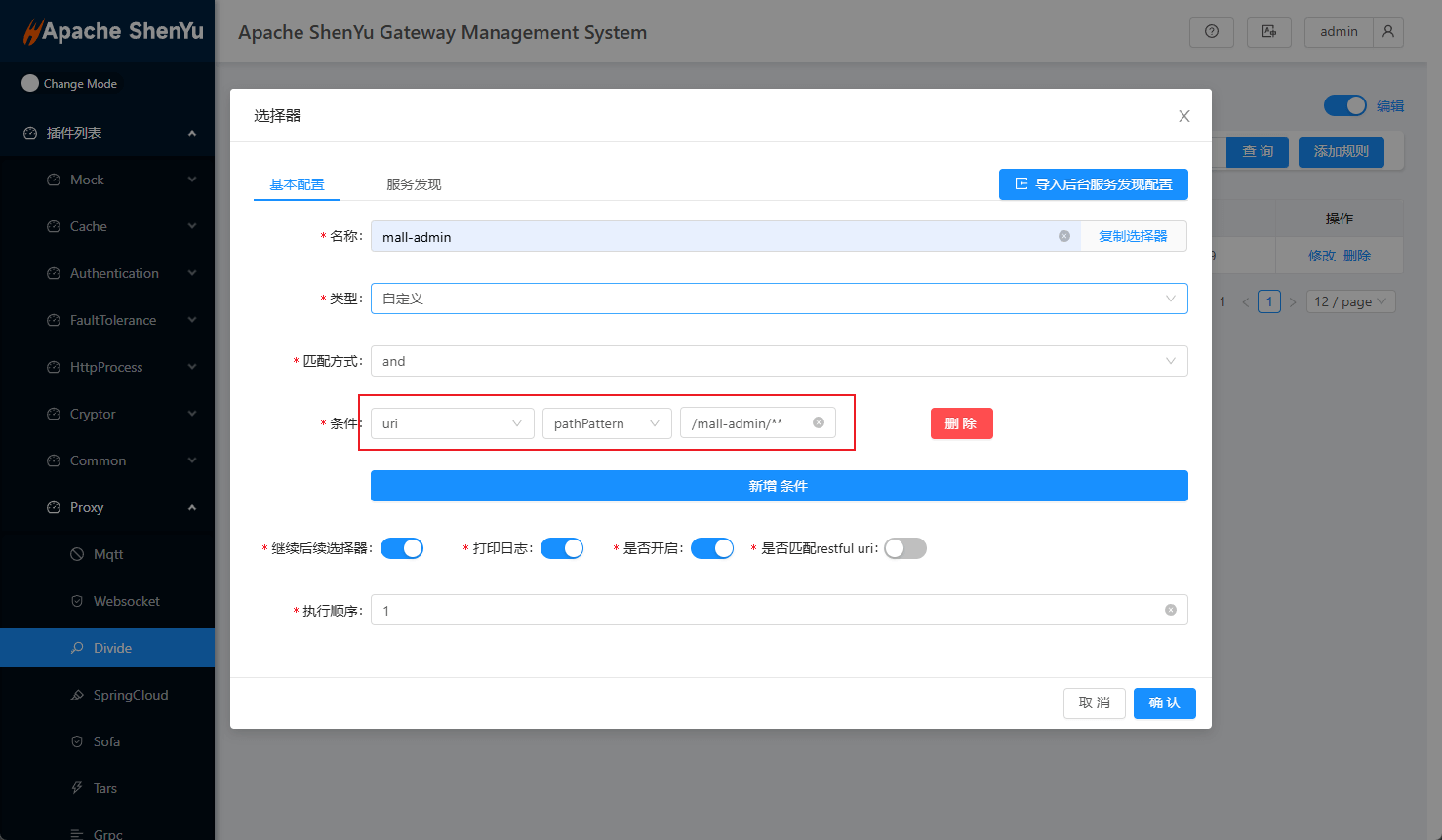插件列表->Proxy->Divide功能中先添加选择器,这里以mall-admin为例,首先是基本配置;