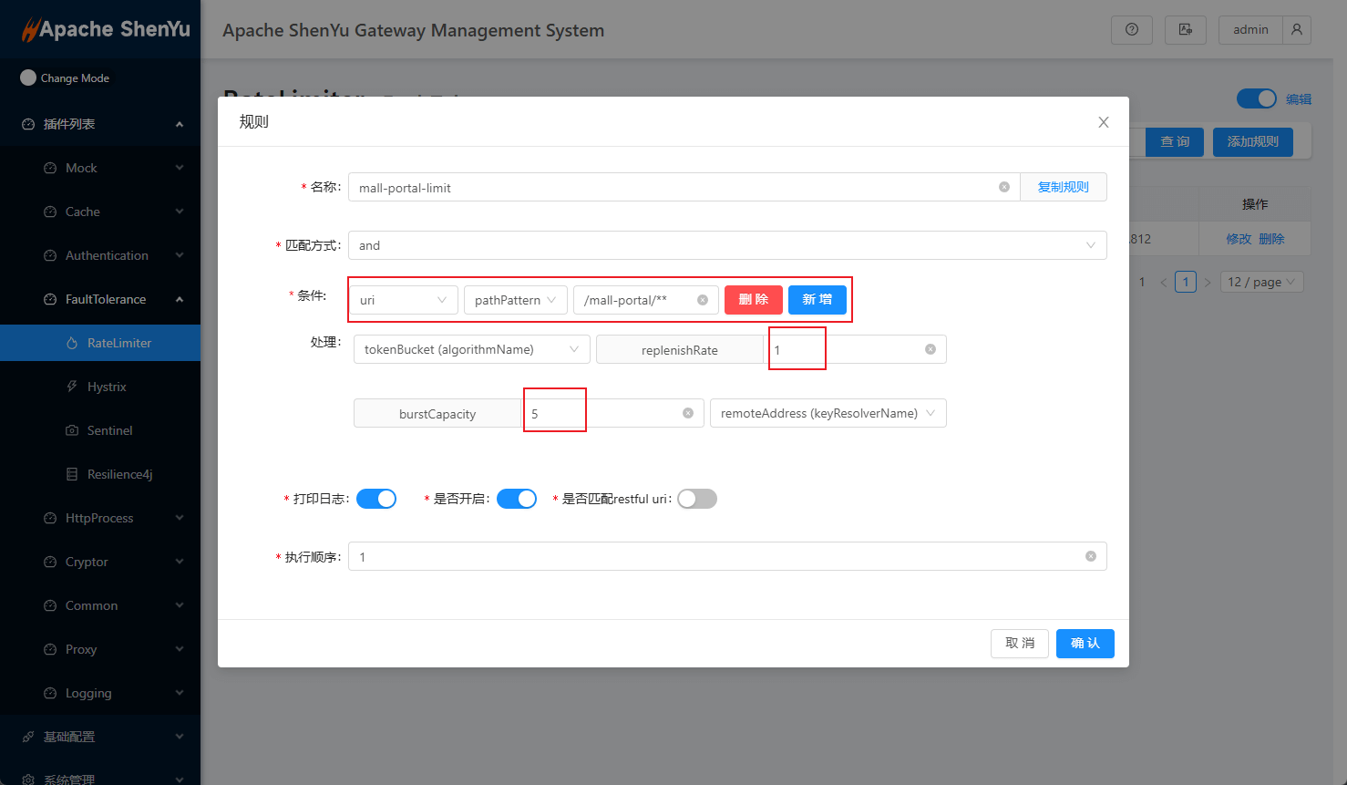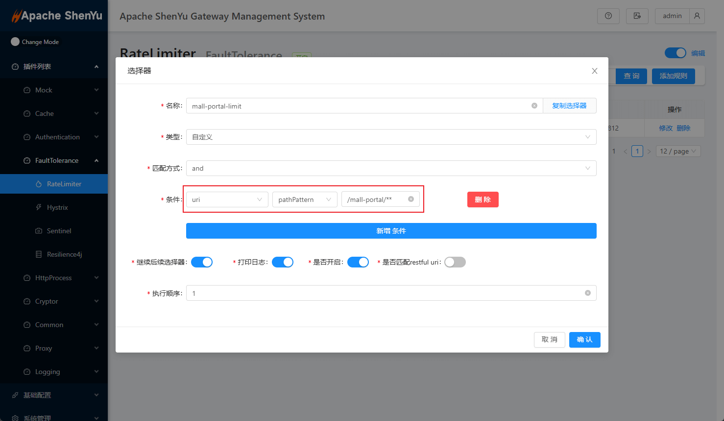 插件列表->FaultTolerance->RateLimiter中添加好选择器,这里我们对mall-portal中的所有API都进行了限流;
