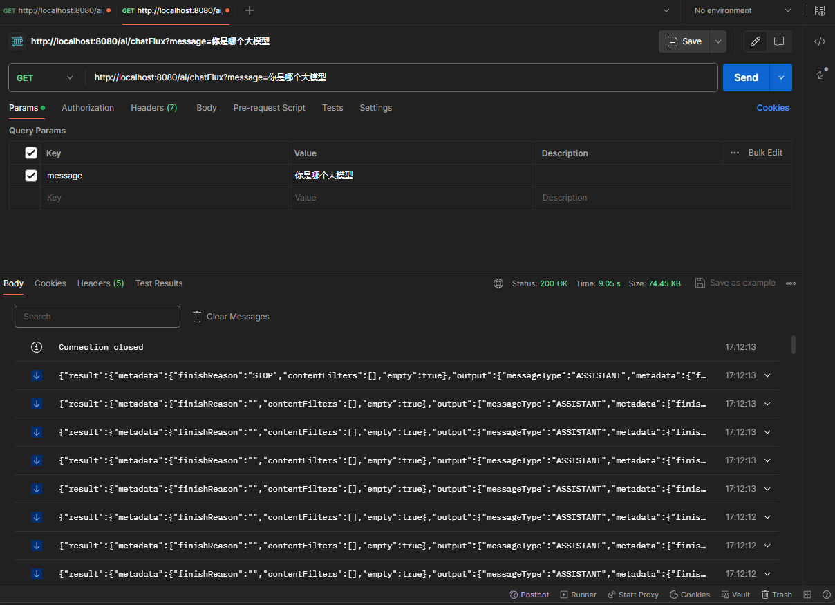 - 接下来调用下流式输出答案的接口,我们可以发现它会持续不断地返回结果,直到请求连接关闭,接口地址:http://localhost:8080/ai/chatFlux