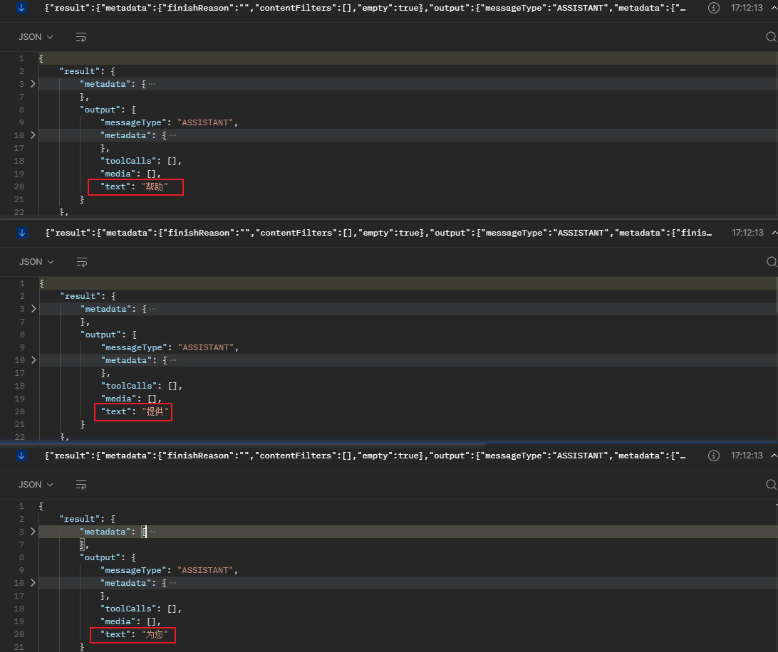 result.output.text这个属性里面,我们可以通过接口中的text属性的拼接来获得完整的回答。