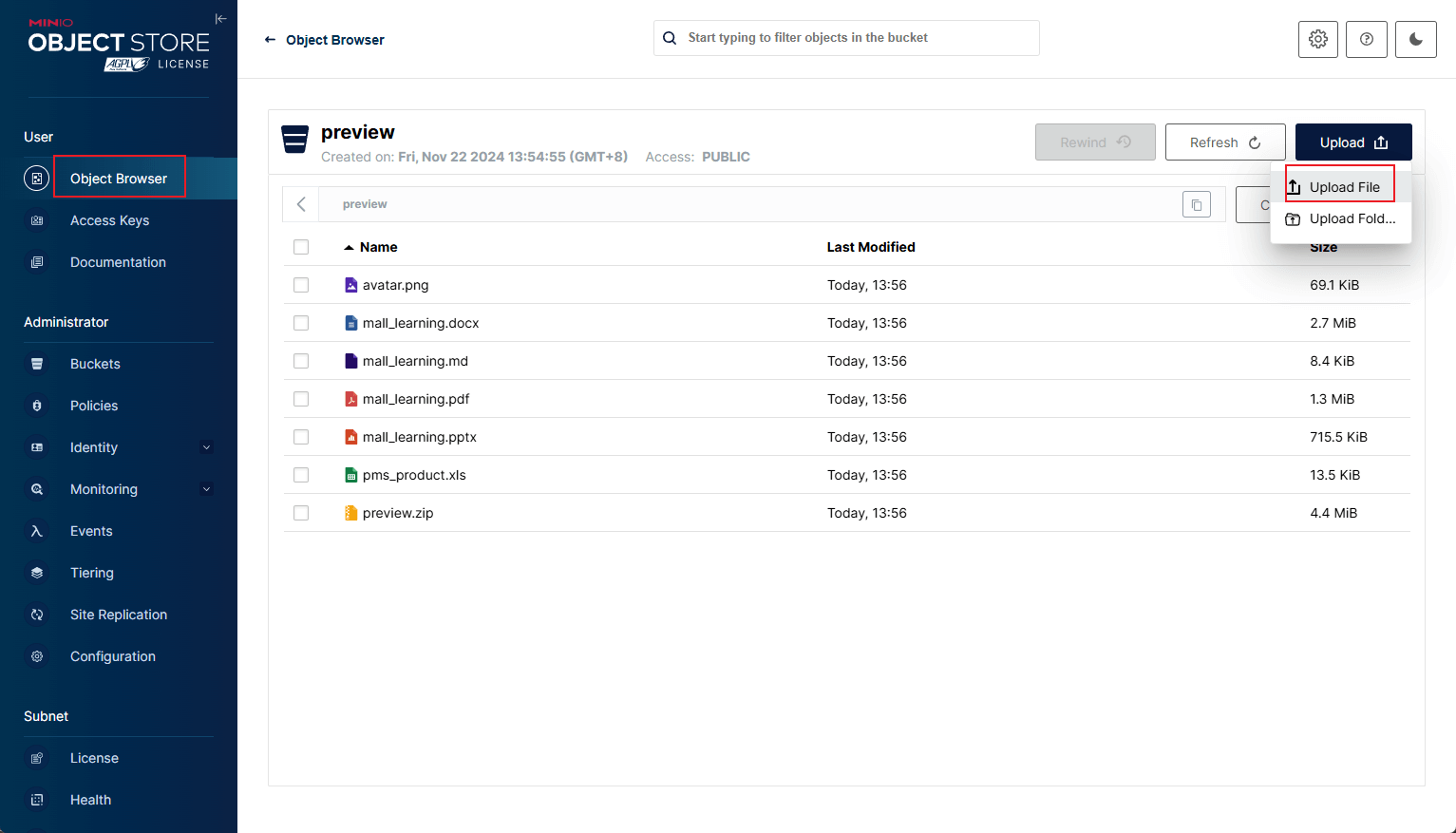 - 之后我们就可以往存储桶中上传文件了,上传好测试的文件;