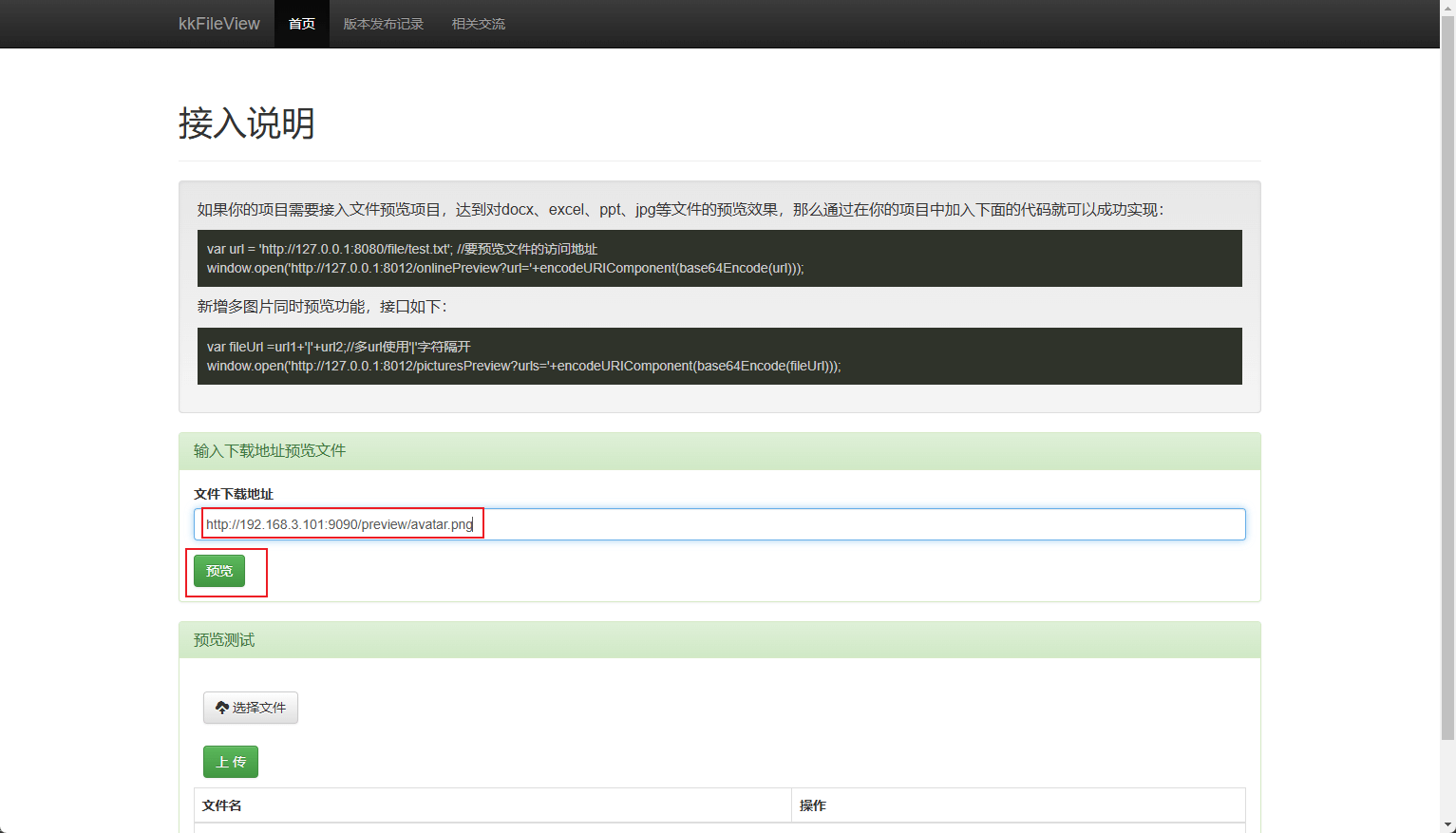 - 我们需要先打开kkFileView的预览测试页,输入文件名称后就可以获取到预览链接了:http://192.168.3.101:8012