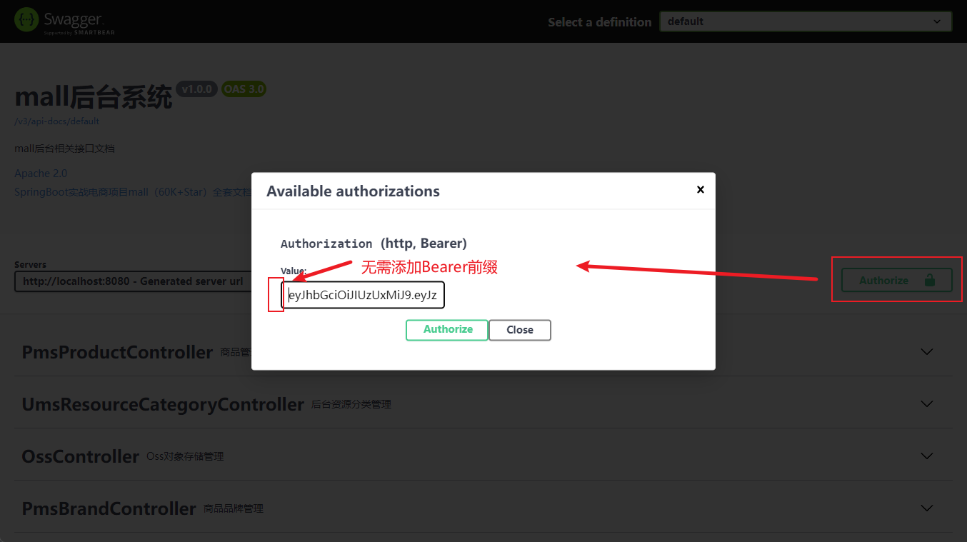 特别注意,添加认证请求头时,已经无需添加Bearer前缀,SpringDoc会自动帮我们添加的。