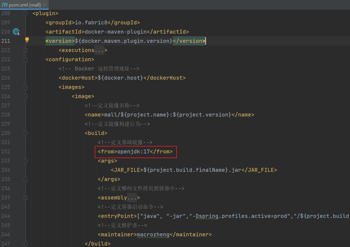 在打包应用的Docker镜像时,我们也需要配置项目使用openjdk:17,这里在项目根目录下的pom.xml中修改docker-maven-plugin插件配置即可。
