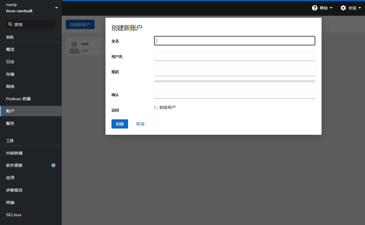 Cockpit是CentOS 8内置的一款基于Web的可视化管理工具,对一些常见的命令行管理操作都有界面支持,比如用户管理、防火墙管理、服务器资源监控等,使用非常方便,号称人人可用的Linux管理工具。