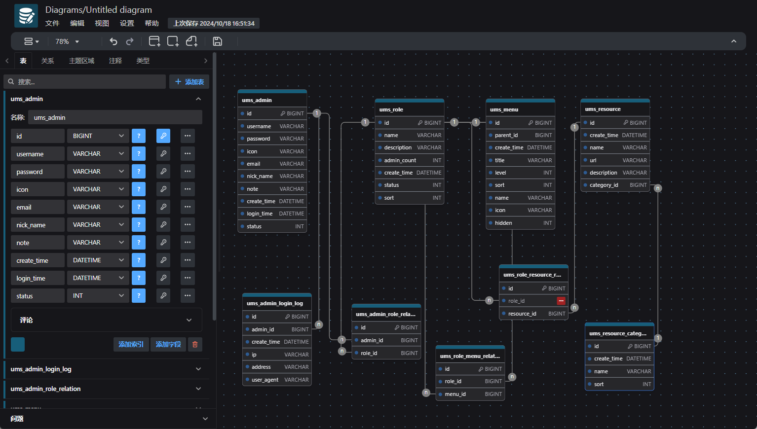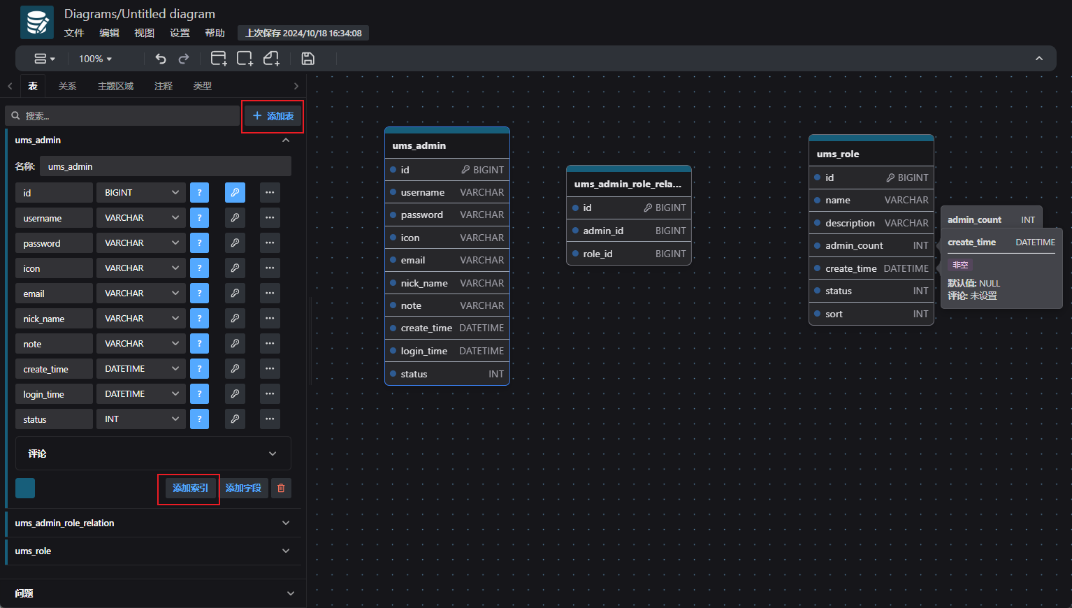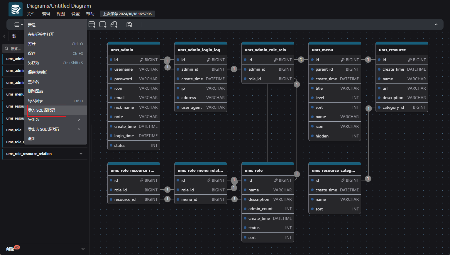 这里以我的mall电商实战项目的权限模块为例,来介绍下DrawDB的使用。