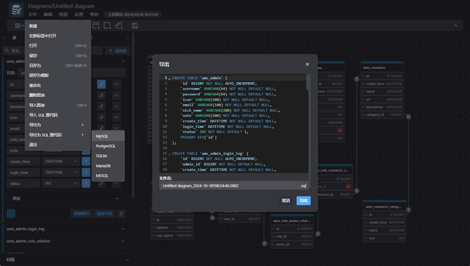 - 我们可以通过DrawDB的导出功能将数据库设计导出到SQL文件中,这里支持MySQL、PostgreSQL、SQLite等常用数据库;