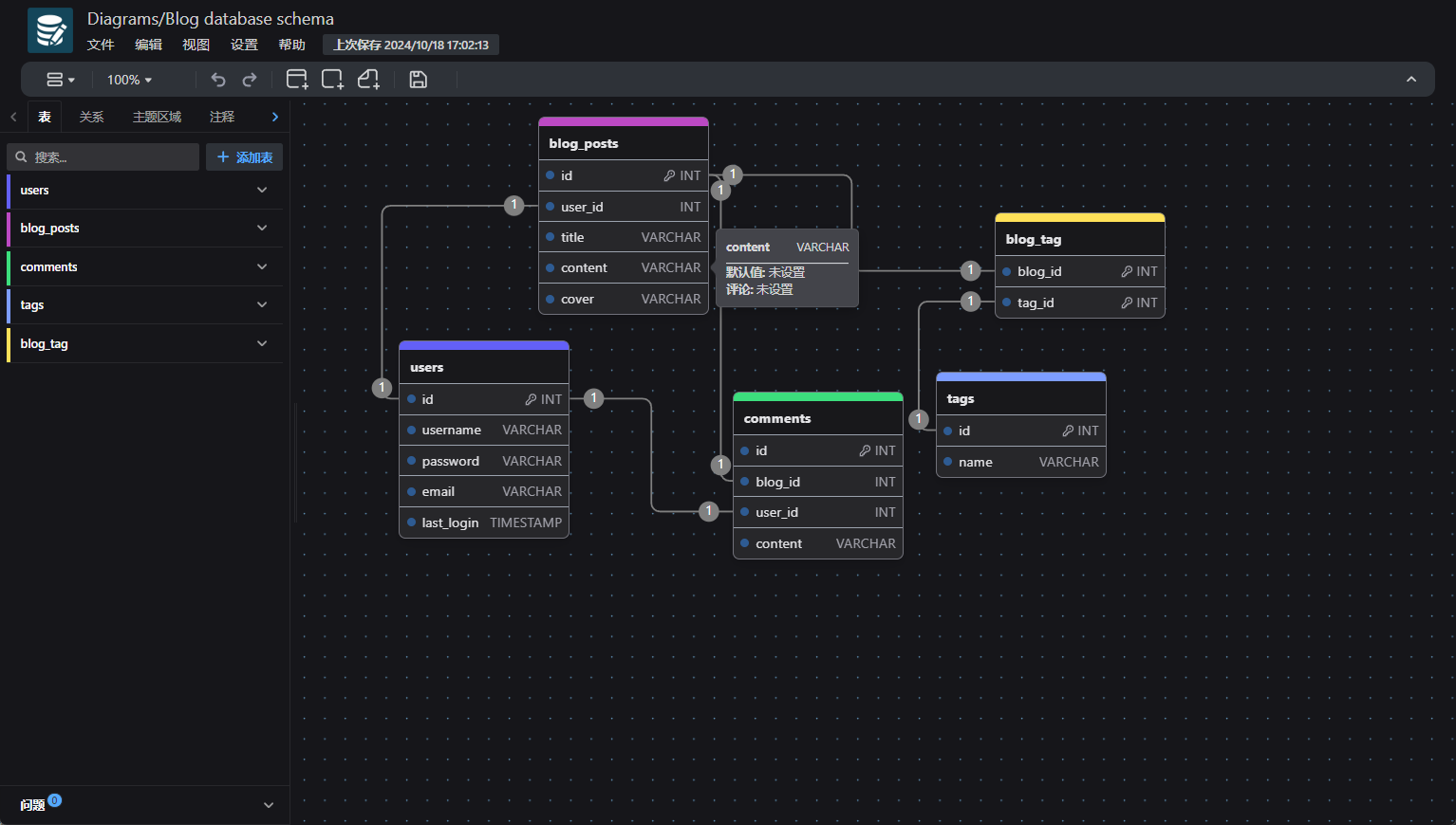 DrawDB能支持深色和浅色两种主题,我们可以通过主题功能来切换,我们上面使用的是深色主题,这里来看下浅色主题,还是挺炫酷的!