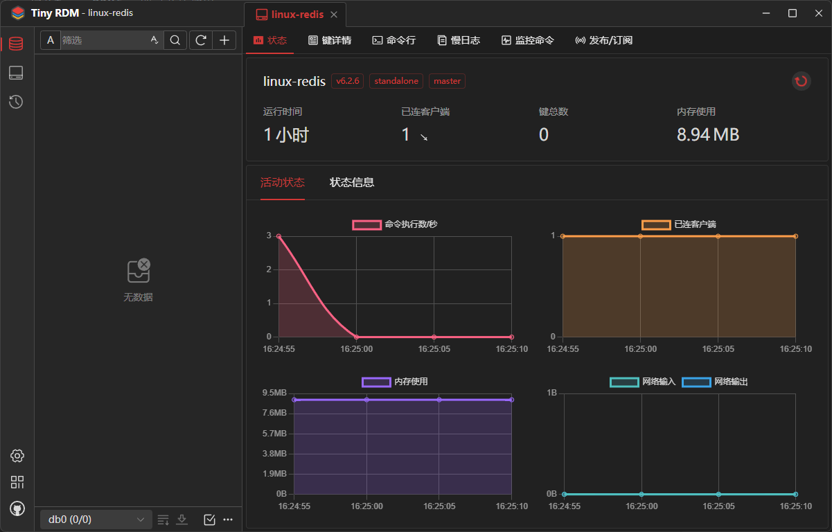 - 点击连接进入后,我们可以看到Redis的监控信息,包括命令执行数、已连接客户端、内存占用等信息;