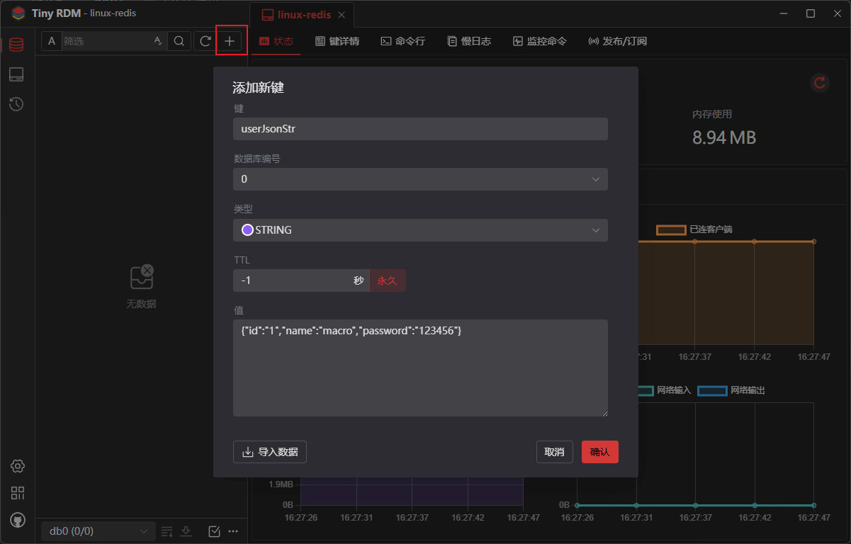 加号,我能可以往Redis里面添加数据,这里先添加一个String类型的数据;