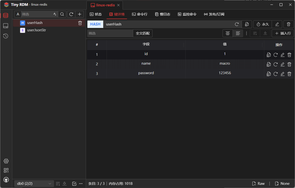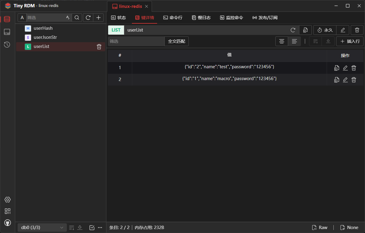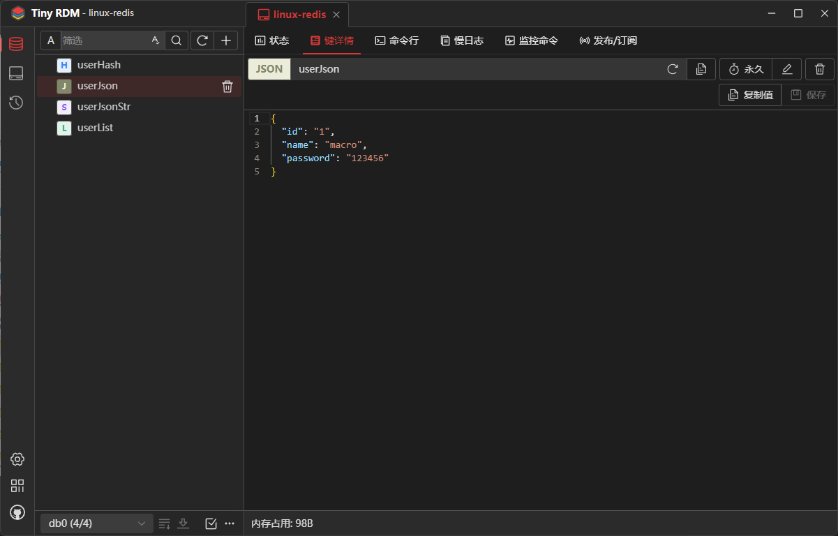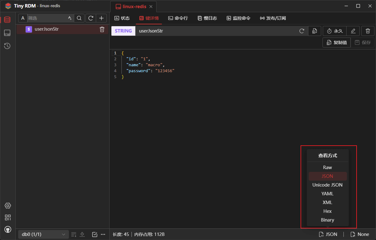 - 由于我们添加的数据是JSON字符串,Tiny RDM会自动使用JSON格式来显示,当然Tiny RDM也是支持其他格式来查看数据的;