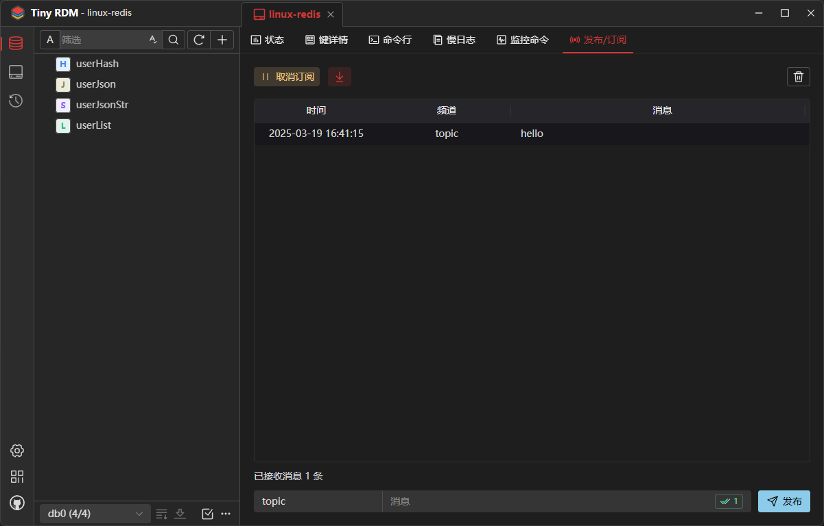 发布/订阅功能我们可以往指定的频道发布消息并接收;