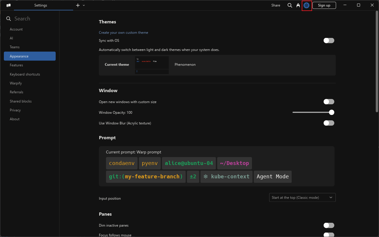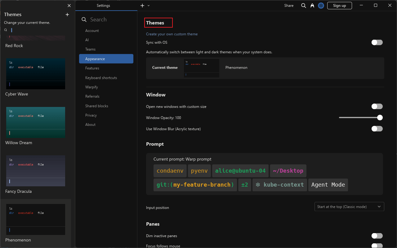 - 例如进行主题的设置,Warp支持多达10种主题;