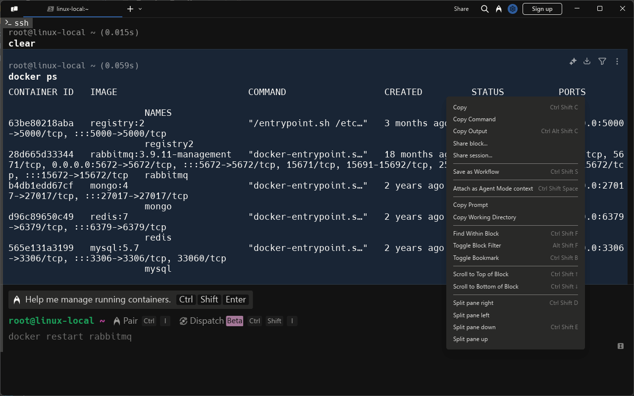 ssh {username}@{hostname_or_ip}- Warp和传统的终端工具使用起来有所不同,它的命令输入栏永远在最下面,而且它会把输入的命令和输出的内容组合成一个block来进行显示,右键这个block还可以进行一些列的操作;