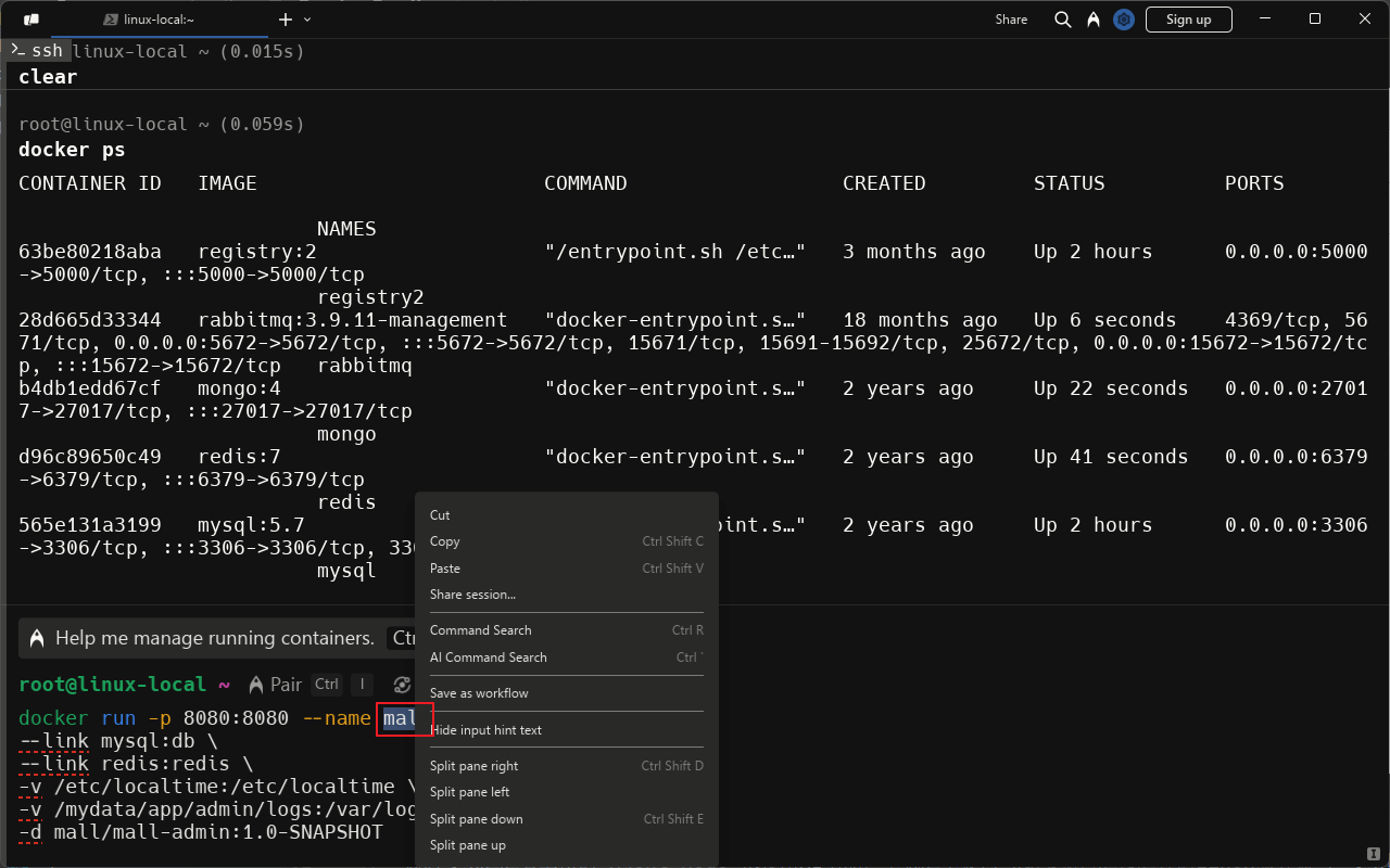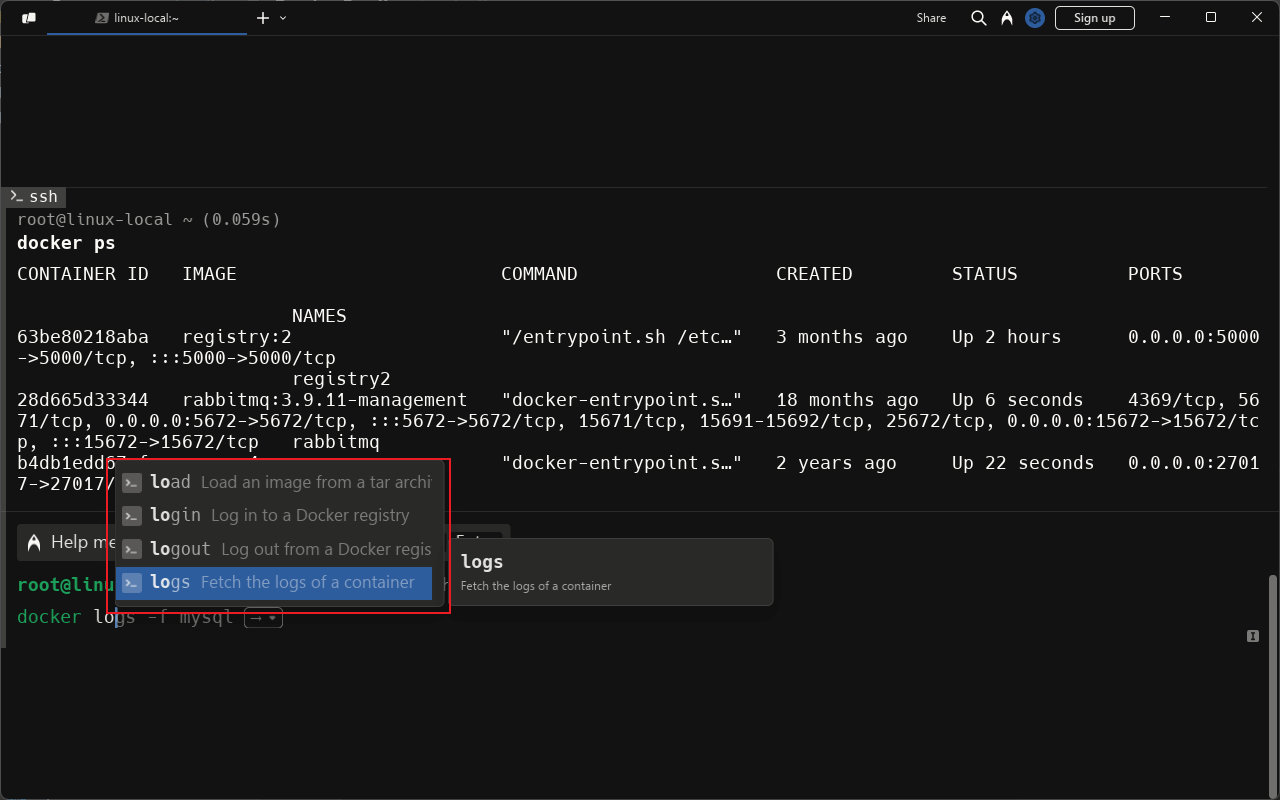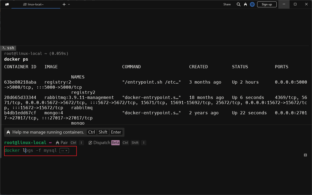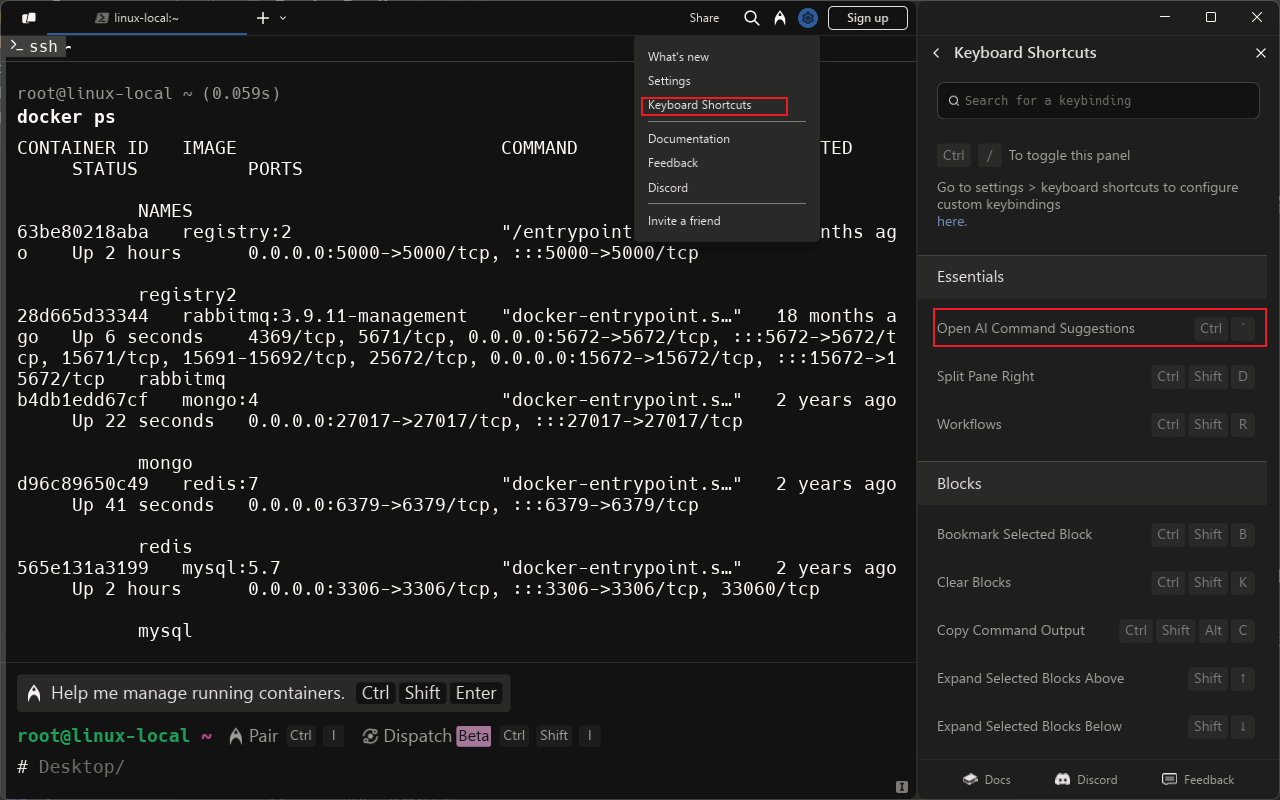 Ctrl+·来调用AI Command,例如提问如何查看所有Docker镜像,Warp会把对应的命令告诉你;